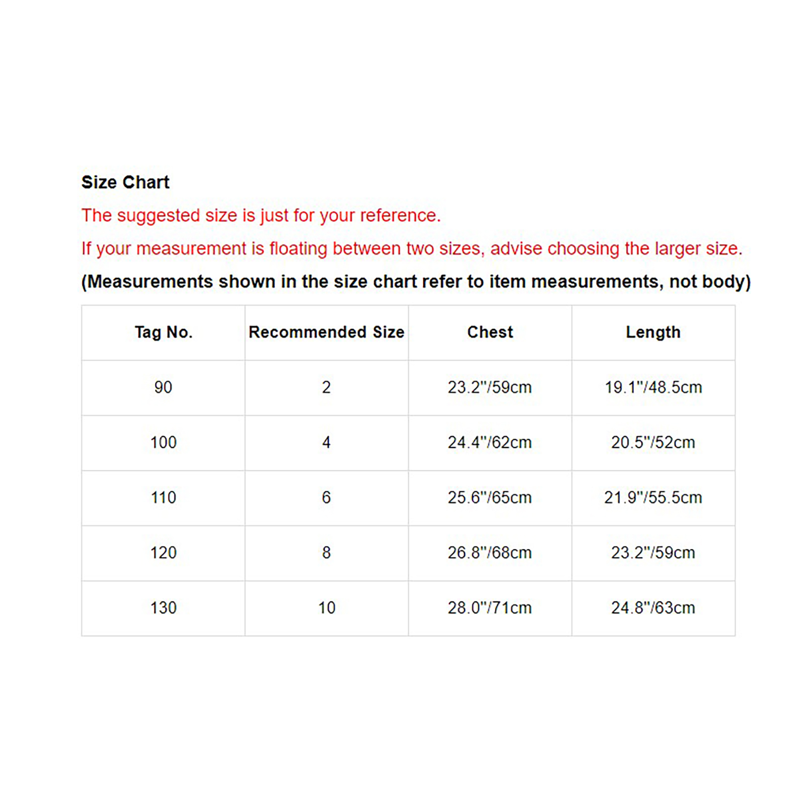 Номер бирки Рекомендуемый размер Грудь Длина 90 1-2 23,2 ''/59 см 19,1 ''/48,5 см 100 2-3 24,4 ''/62 см 20,5 ''/52 см 110 3-4 25,6 ''/65 см 21,9 ''/55,5 см 120 5-6 26,8 ''/68 см 23,2 ''/59 см 130 6-7 28,0 ''/71 см 24,8 ''/63 смПолезные советы: Замеры делаются вручную, поэтому учитывайте небольшие погрешности.