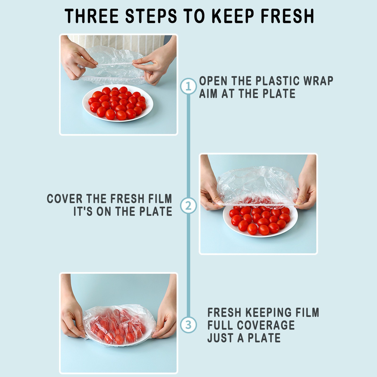 Хранение продуктов питания: Храните и фруктовые мухи вдали от еды. Они очень подходят для семейных кухонь, ресторанов или столовых, и могут содержать свежие фрукты, овощи, напитки и другие остатки пищи и могут храниться в течение длительного времени. Эти пластиковые обертывания используется для пищевых продуктов может использоваться для транспортировки пищевых продуктов в тех случаях, когда вы наслаждаетесь светильник питание, встреч или барбекю.