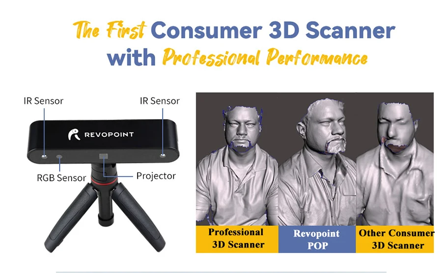 Вот почему мы с гордостью представляем 3d-сканер Revopoint POP, очень сложное, но чрезвычайно компактное устройство для визуализации, которое делает то, что делают 3D сканеры промышленного уровня, но в гораздо доступном виде. Меньше см.