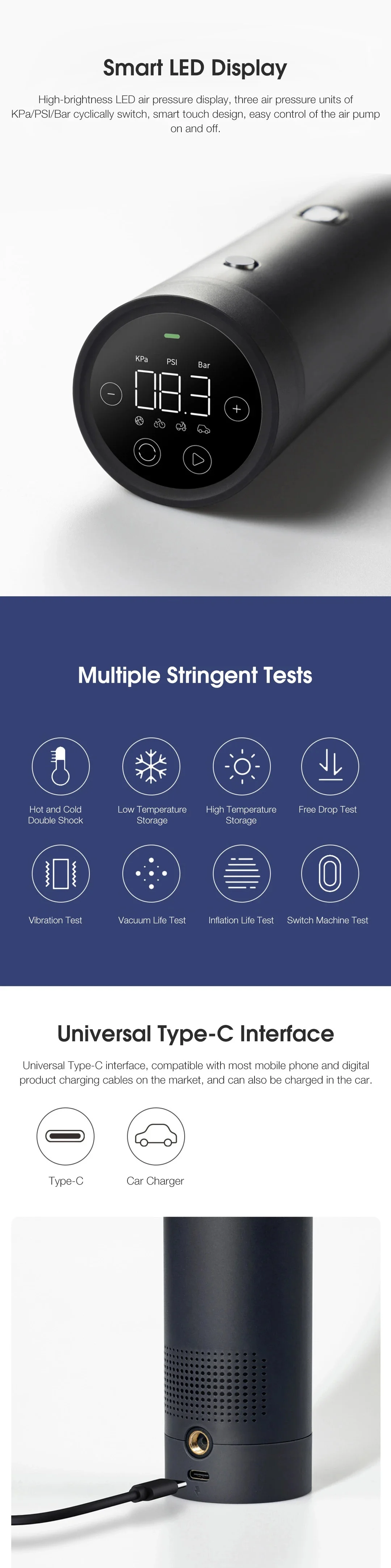 * Интеллектуальный экран, сенсорная кнопка для запуска и остановки. Светодиодный дисплей высокого давления воздуха, три блока давления воздуха кПа/пси/бар циклически переключатель, умный сенсорный дизайн, легкий контроль воздушного насоса ВКЛ и ВЫКЛ.