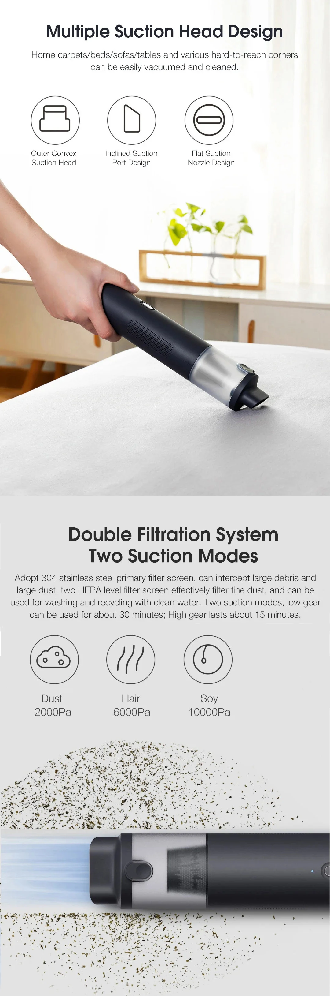 * Два вакуумных режима: низкий конец и высокий конец. Белый светильник низкого класса всегда включен, который используется для около 30 минут, удовлетворяя основным требованиям очистки; Высококачественный синий светильник всегда включен, который используется для около 15 минут, С более сильной мощностью всасывания и очистки.