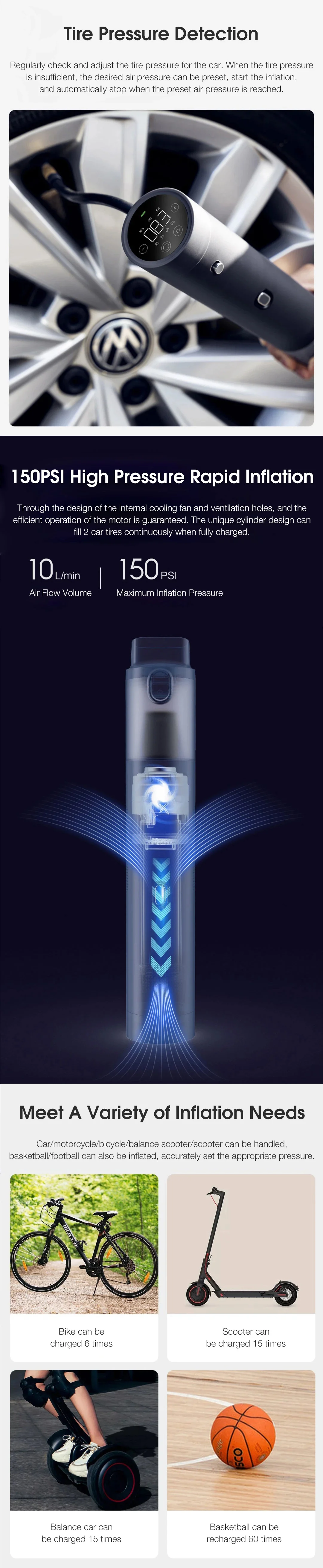 * Уникальный дизайн цилиндра реализует поток супер высокого давления 10 л/мин, максимальное давление надувания достигает 150 фунтов на квадратный дюйм, и полная зарядка может непрерывно заполнять 2 автомобильных шины.