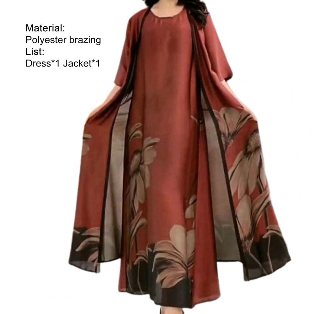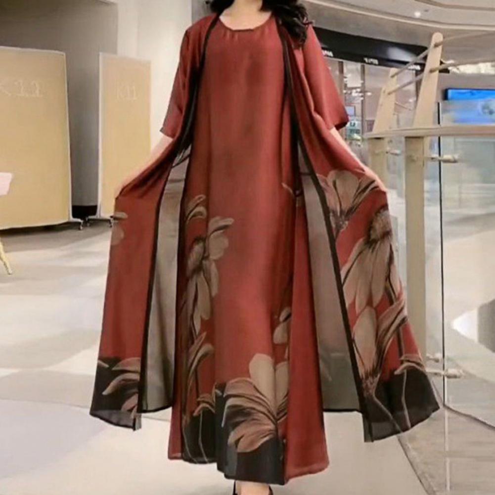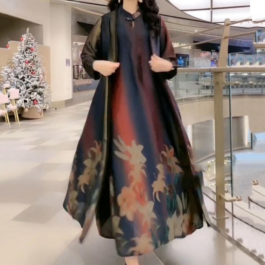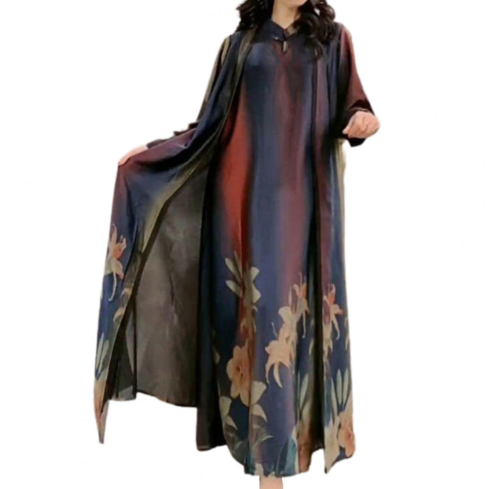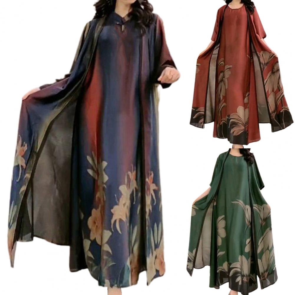 Платье в китайском стиле с цветочным принтом; Комплект из двух предметов; Пальто с короткими рукавами и круглым вырезом; Женская одежда