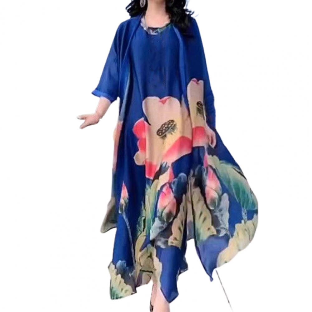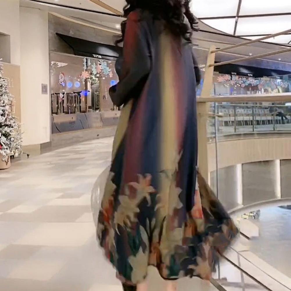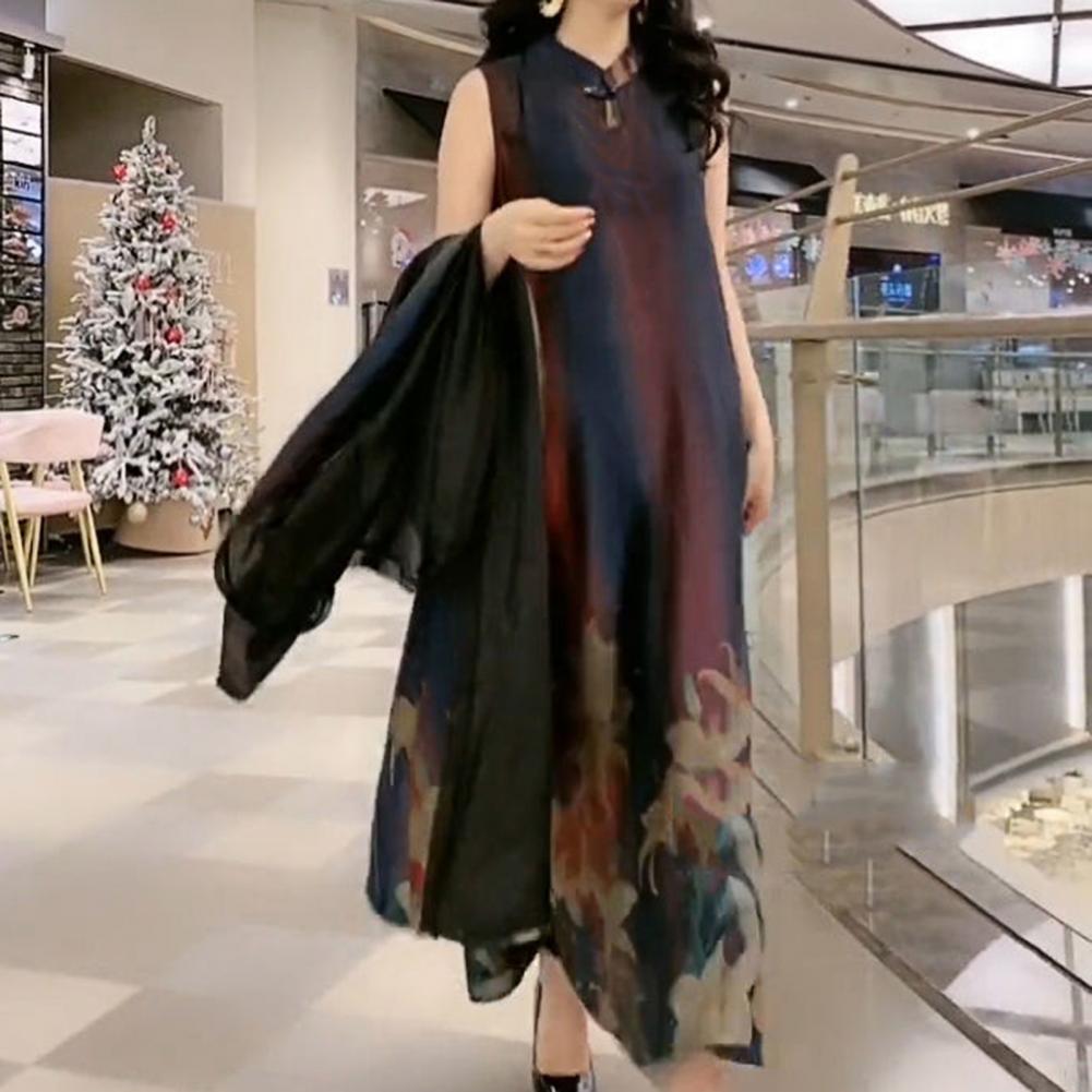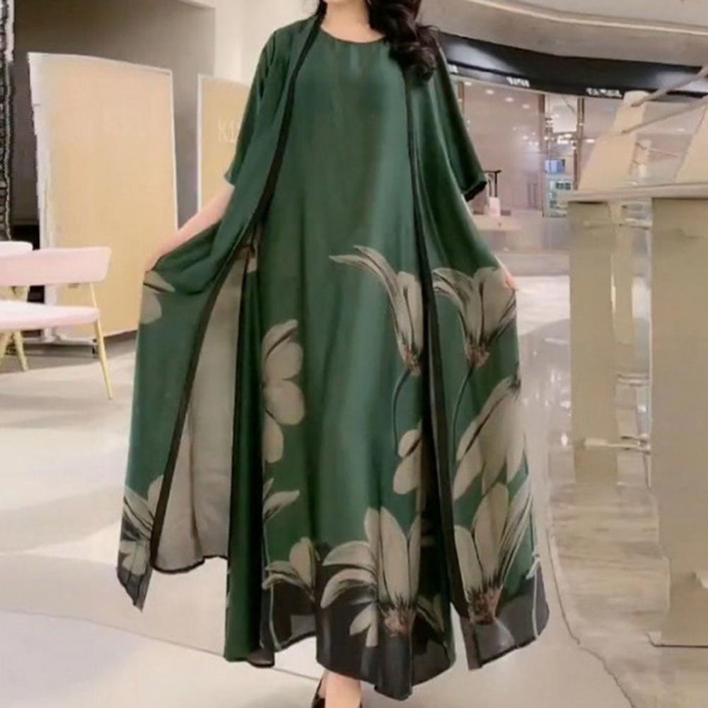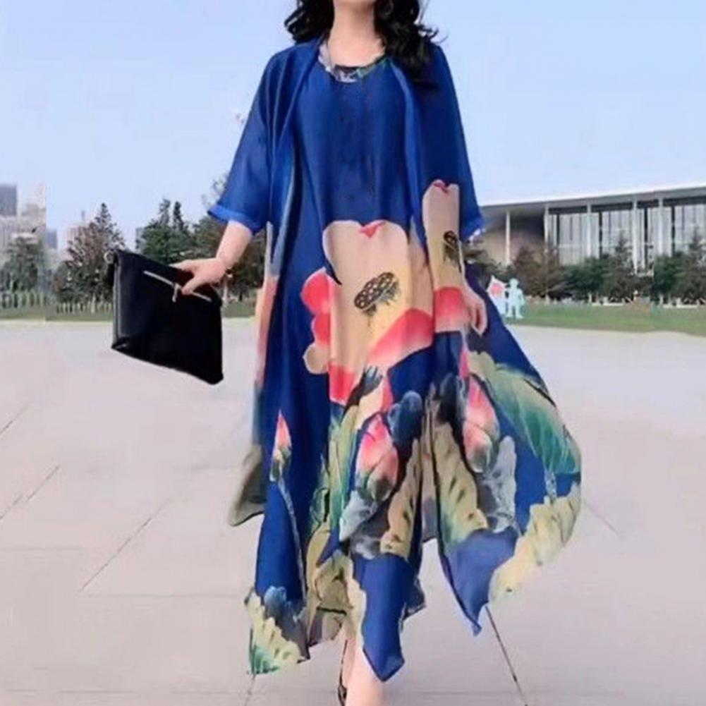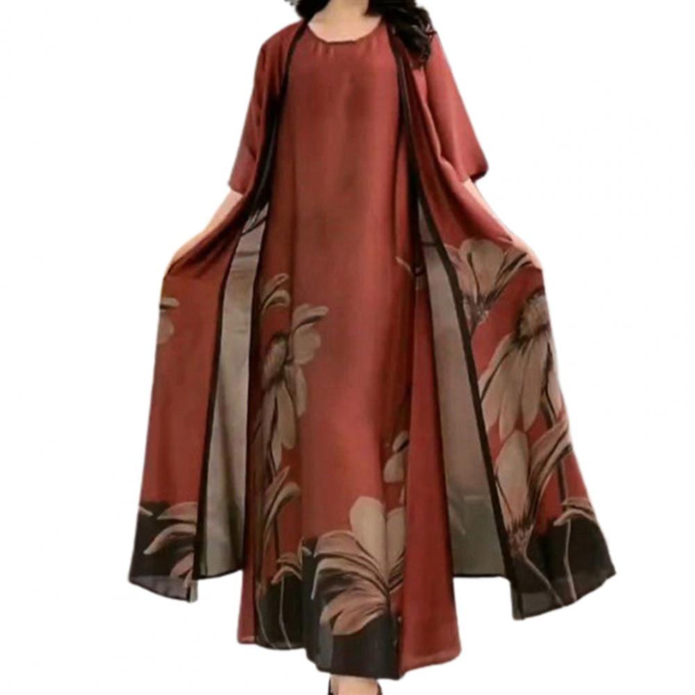 Платье в китайском стиле с цветочным принтом; Комплект из двух предметов; Пальто с короткими рукавами и круглым вырезом; Женская одежда