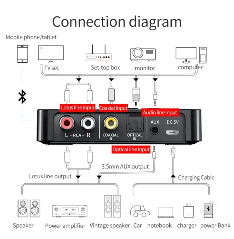 Совместимые устройства: мобильные телефоны и PAD с системой Android, IOS, проводные динамики, усилители мощности и bluetooth-динамики или наушники, поддерживающие A2DP/протокол, подключены для использования.
