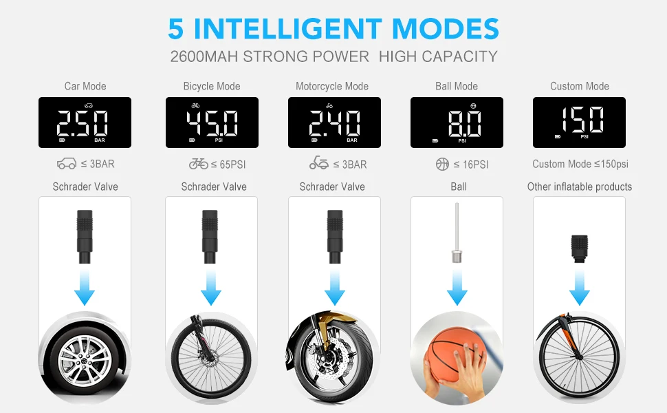 С большой емкостью литиевой батареи 2600 мАч, он поддерживает максимальный инфляционный поток до 150 фунтов на квадратный дюйм.