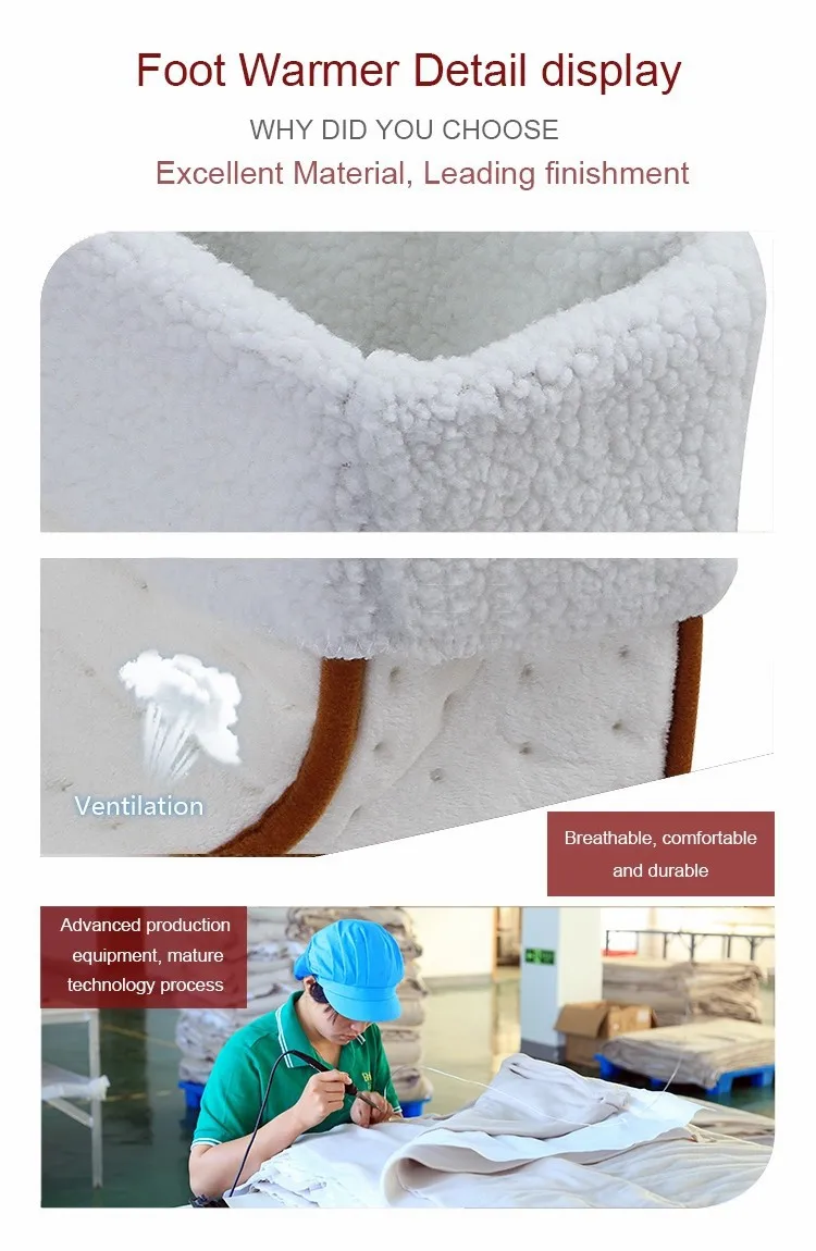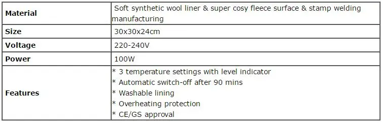Эта теплая нога имеет очень уютную флисовую поверхность, размер ноги теплее 30x30x24 см, напряжение 220-240 В, который подходит для европейского рынка. Важно, что он имеет 3 температуры на ваш выбор. Сертификаты CE GS гарантируют безопасность продукции.