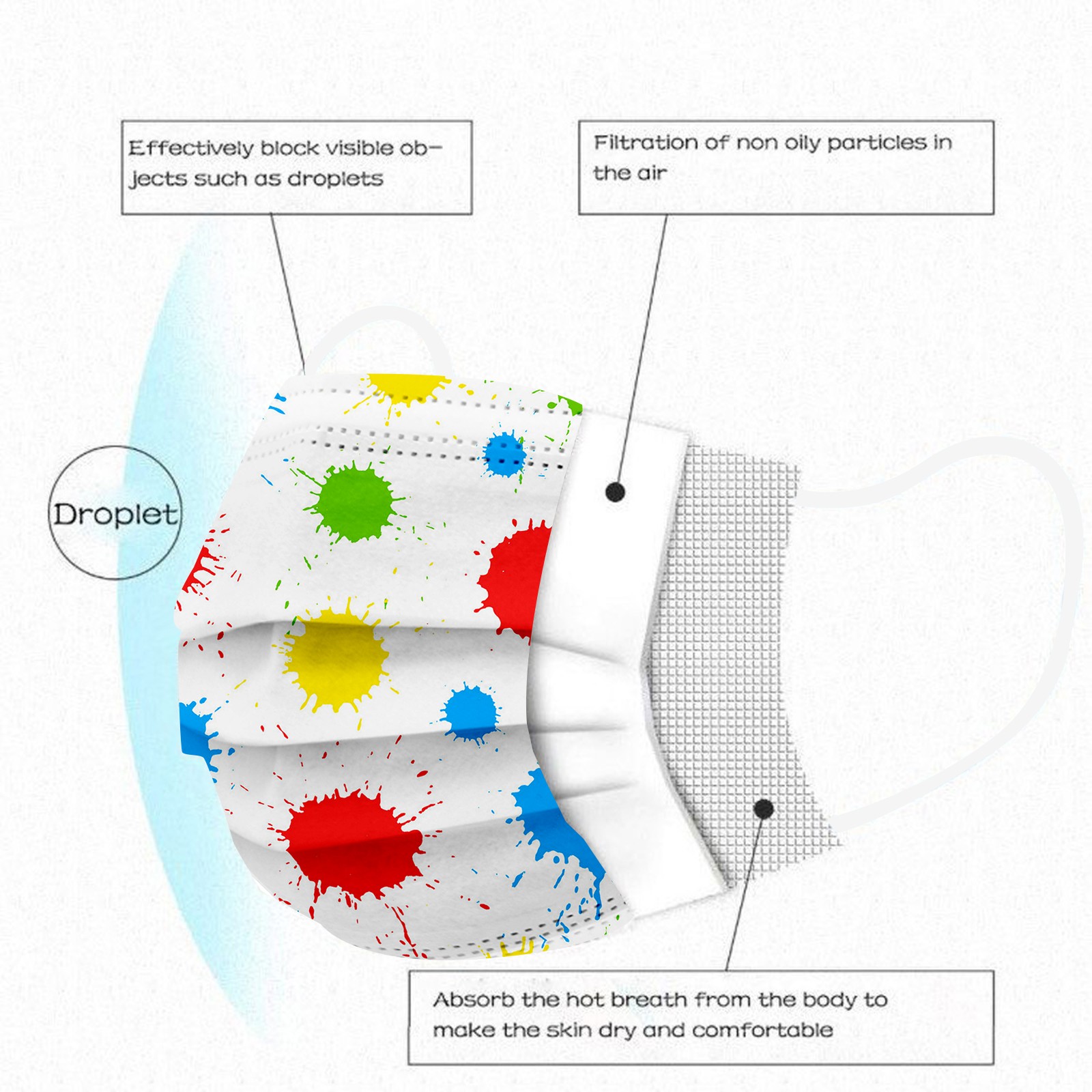 3 слояТкань с водяными шипамиОдноразовая маска изготовлена из 3 слоевТкань с водяными шипамиМатериал, безвредный для здоровья и безопасный для использования. Дышащий материал и милые узоры, что делает его полезным и модным. Специальный 3-слойныйТкань с водяными шипамиДизайн обеспечивает некоторую защиту от выхлопных газов автомобилей, пыльцы и т. д. эластичная петля для ушей, легко носить и не давит на уши. Маникюрный салон или любые другие области, где может потребоваться защита