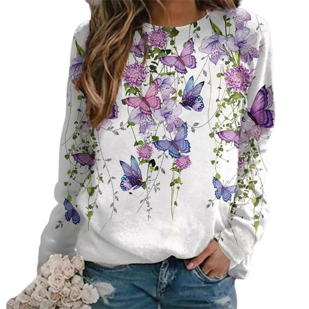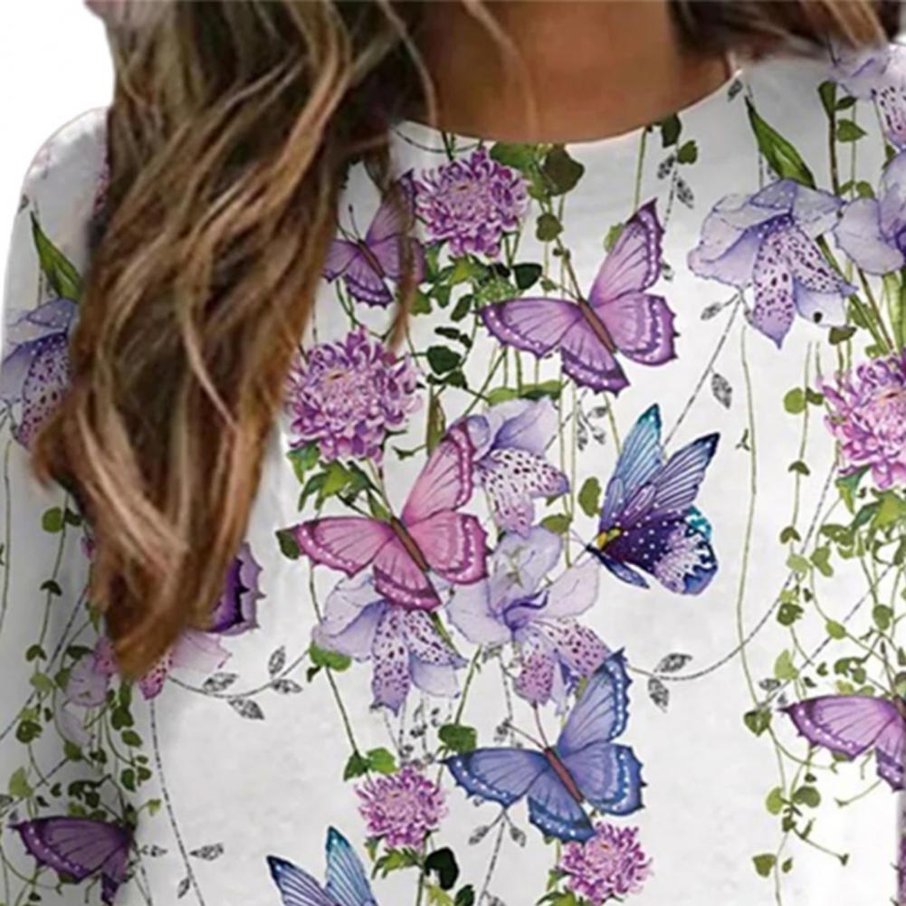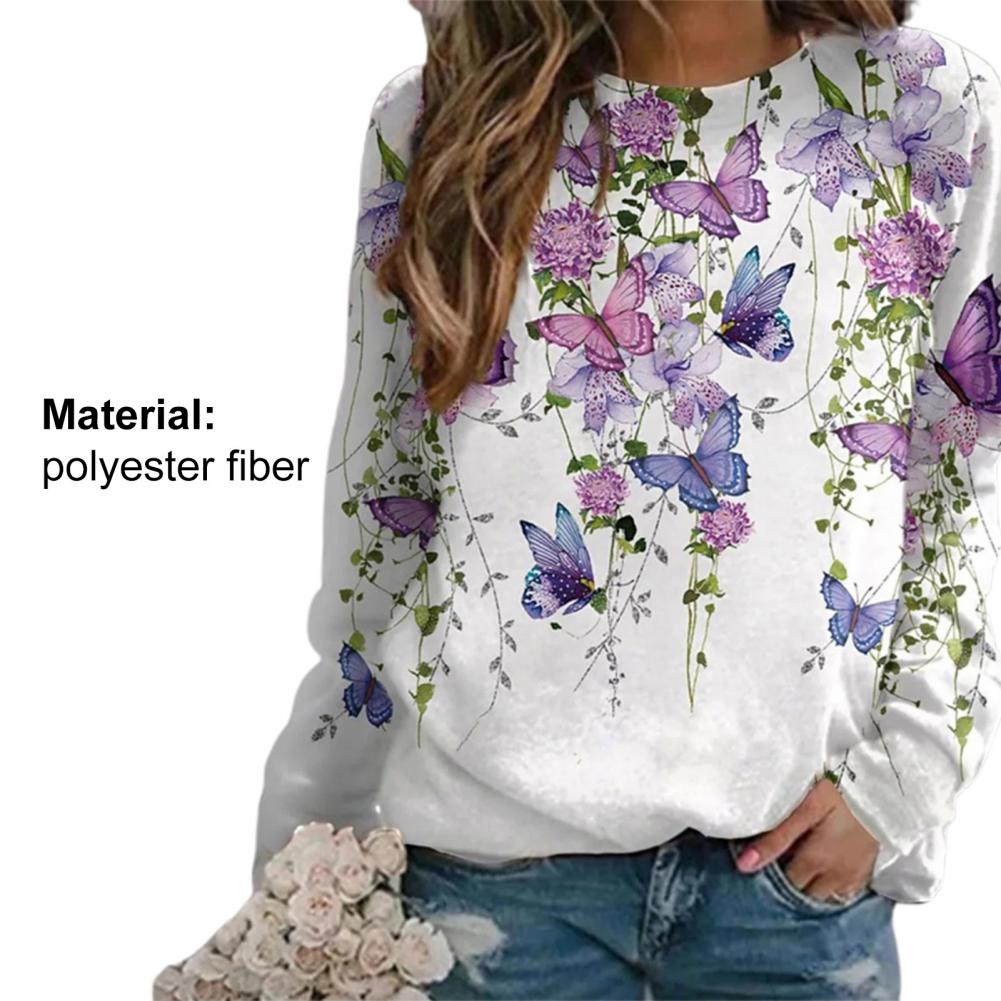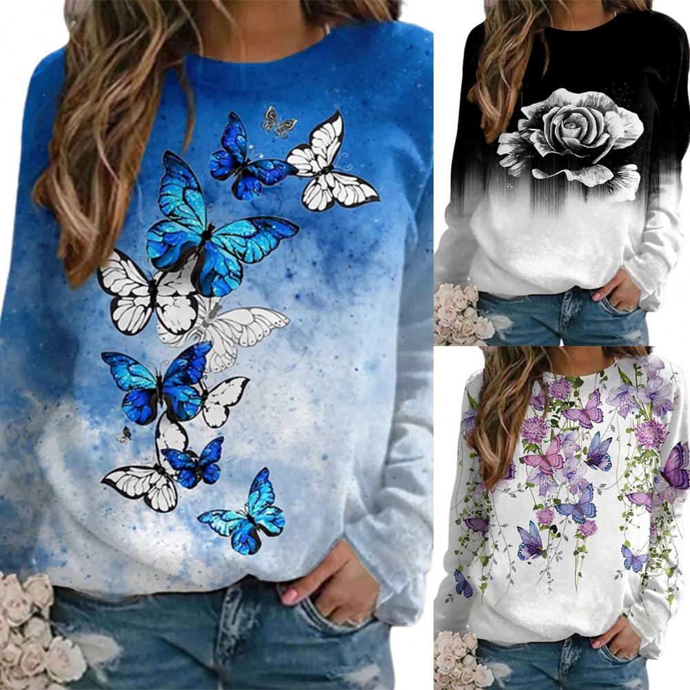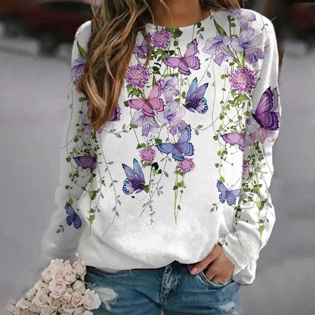 Женская блузка с цветочным принтом и принтом бабочек, длинный рукав, тонкий свободный пуловер с круглым вырезом, топ, уличная одежда