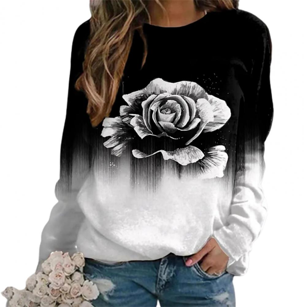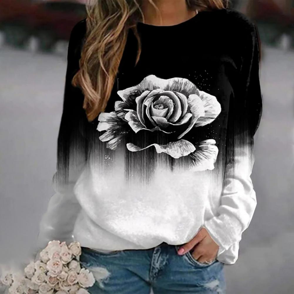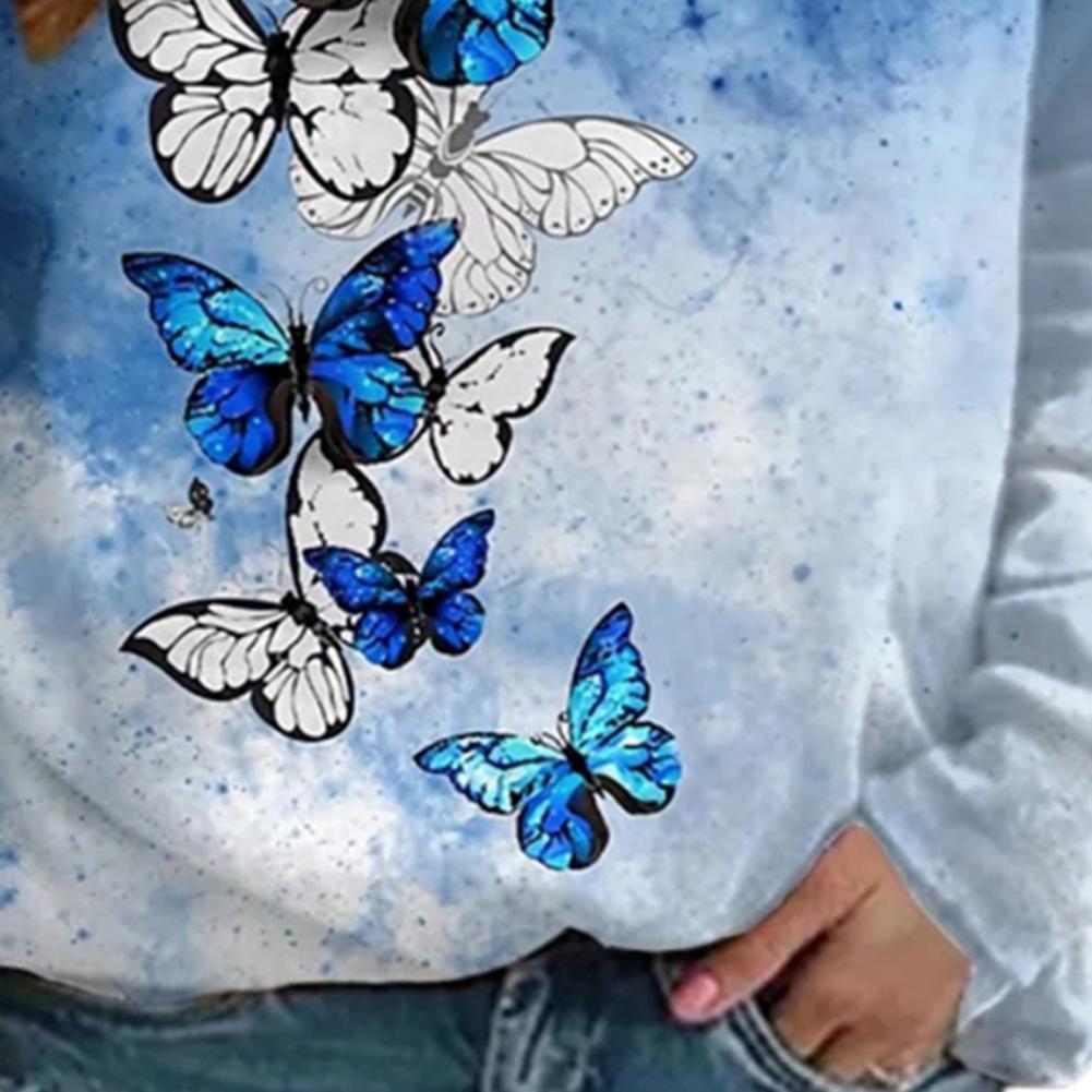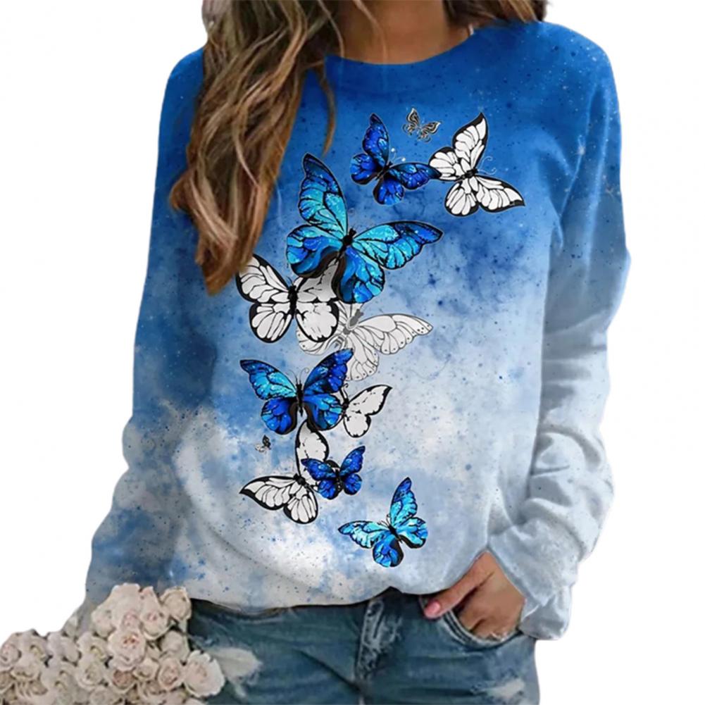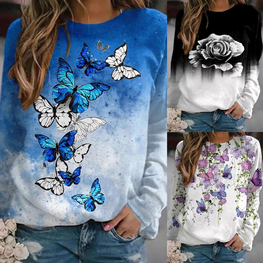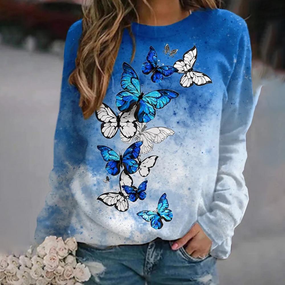Женская блузка с цветочным принтом и принтом бабочек, длинный рукав, тонкий свободный пуловер с круглым вырезом, топ, уличная одежда