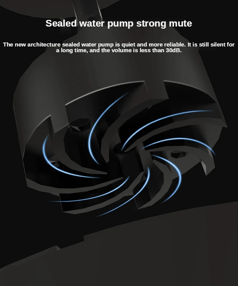 Новая конструкция герметичного водяного насоса более тихая и надежная. Он по-прежнему бесшумный после длительного использования, и объем менее 30 дБ.