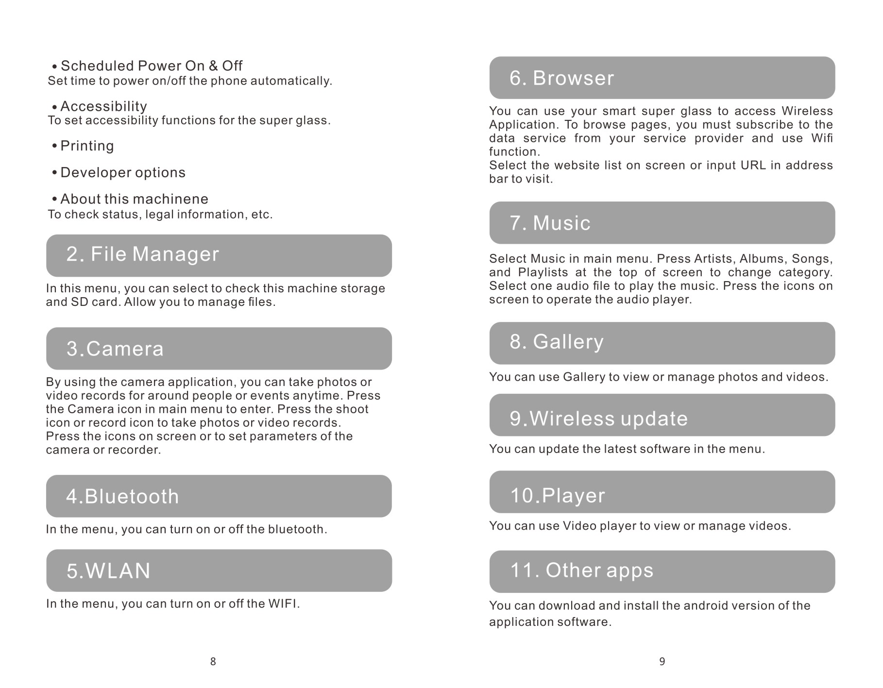 Частный театр:VISION-800-это персональный Мобильный театр, вы можете наслаждаться любимыми фильмами, развлекательными программами, играми и многими другими. Поддержка переключателя функции 2D / 3D, переключение этих очков в 3D кинотеатр, обеспечивает вам Захватывающий игровой опыт.