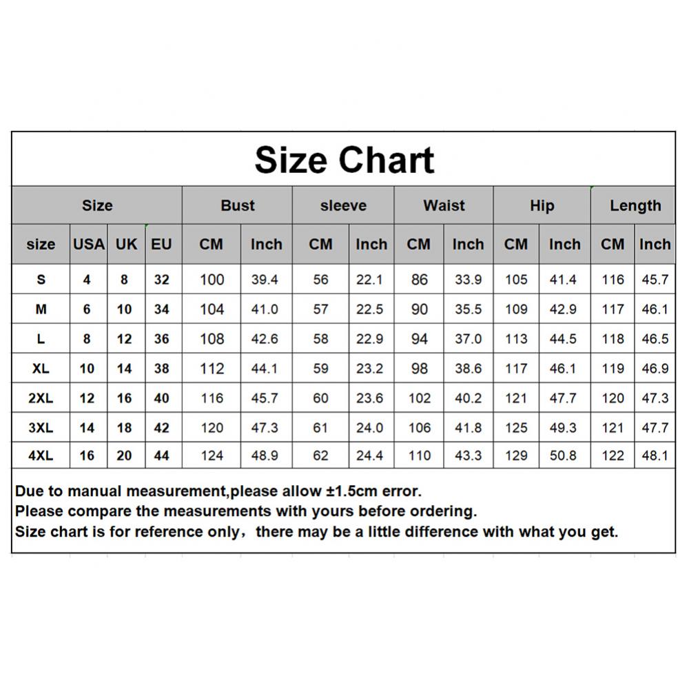 [Наш Размер S] Обхват груди: 100 см/39,37 дюйма, рукав: 56 см/22,05 дюйма, обхват талии: 86 см/33,86 дюйма, обхват бедер: 105 см/41,34 дюйма, длина: 116 см/45,67 "(прибл.)