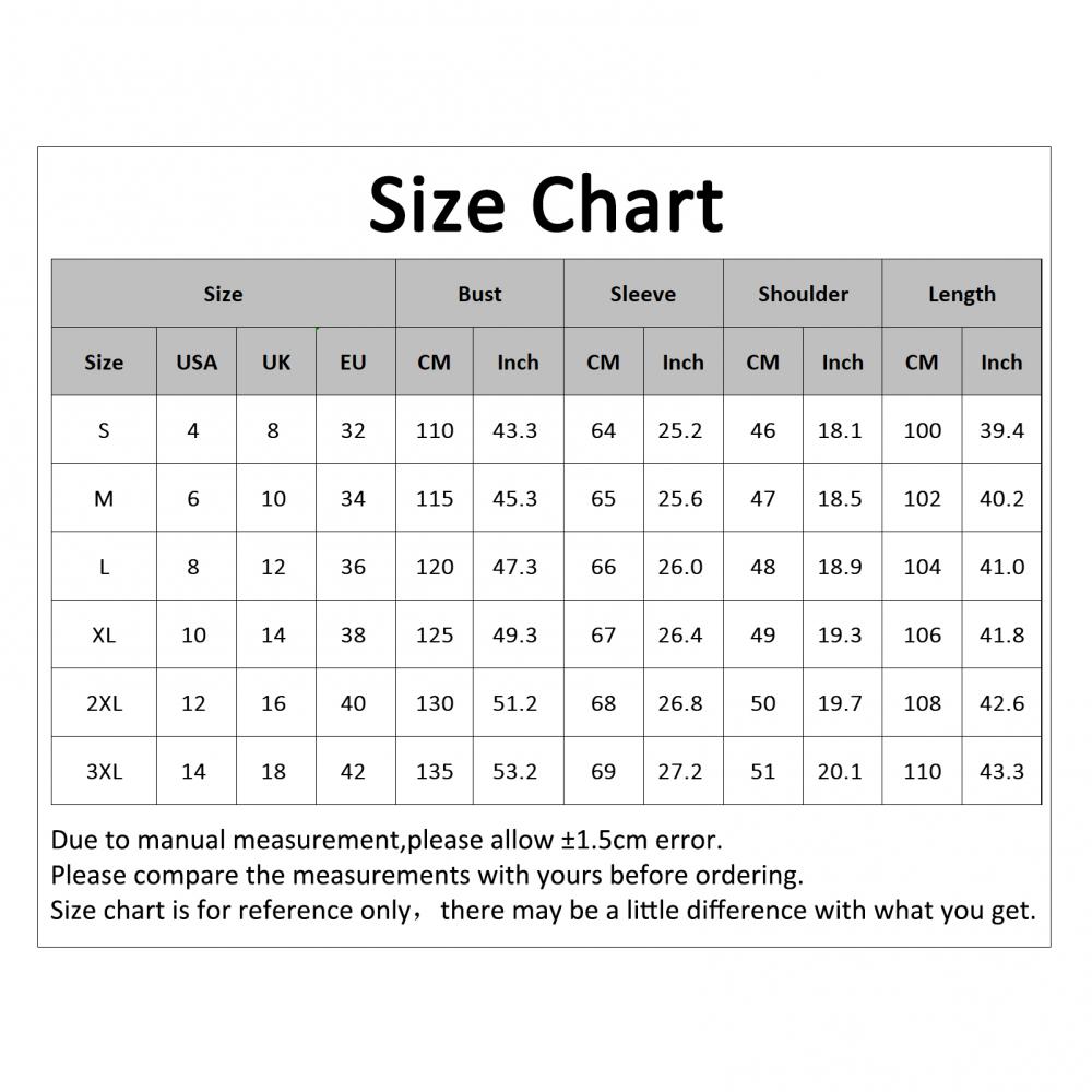 [Наш Размер 2XL] Обхват груди: 130 см/51,18 дюйма, ширина плеч: 50 см/19,69 дюйма, длина рукава: 68 см/26,77 дюйма, длина: 108 см/42,52 дюйма (прибл.)