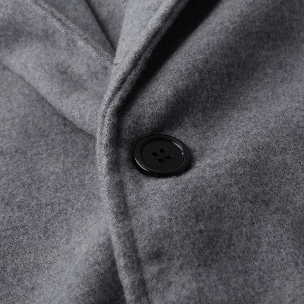 Однотонное пальто с пуговицами, отворотом и длинными рукавами.