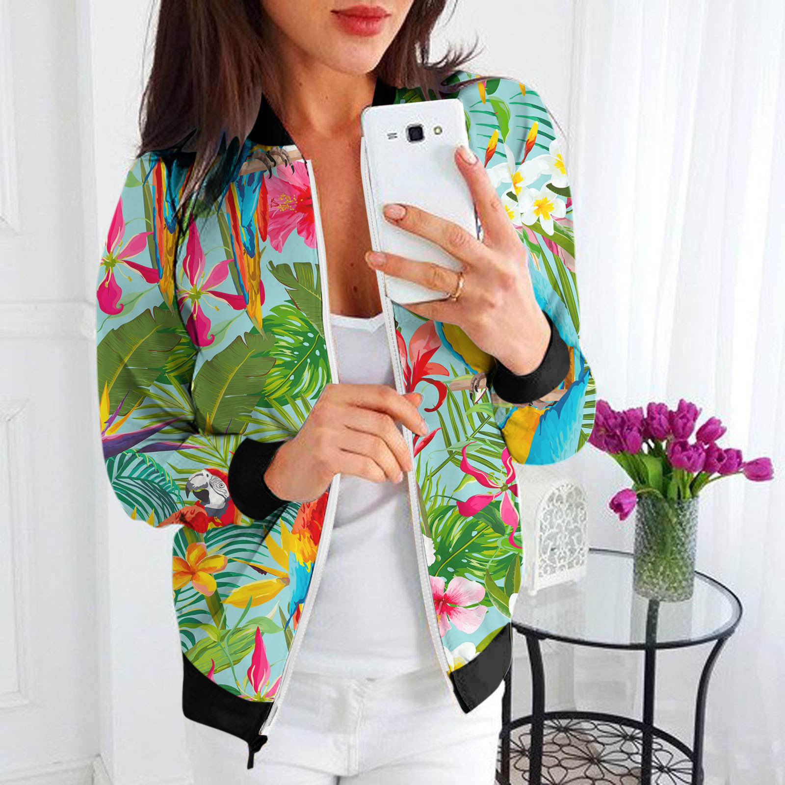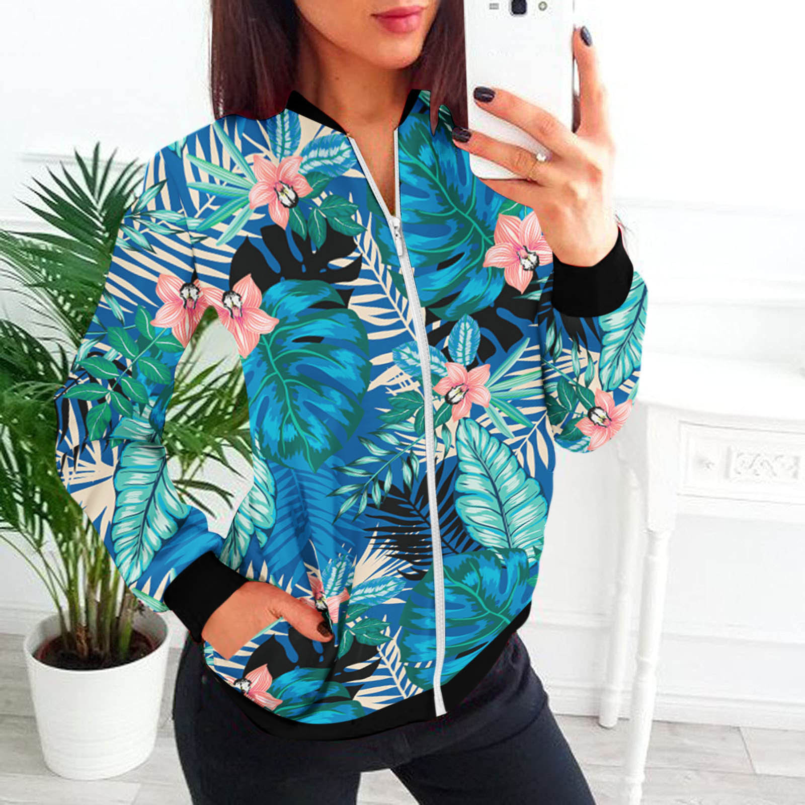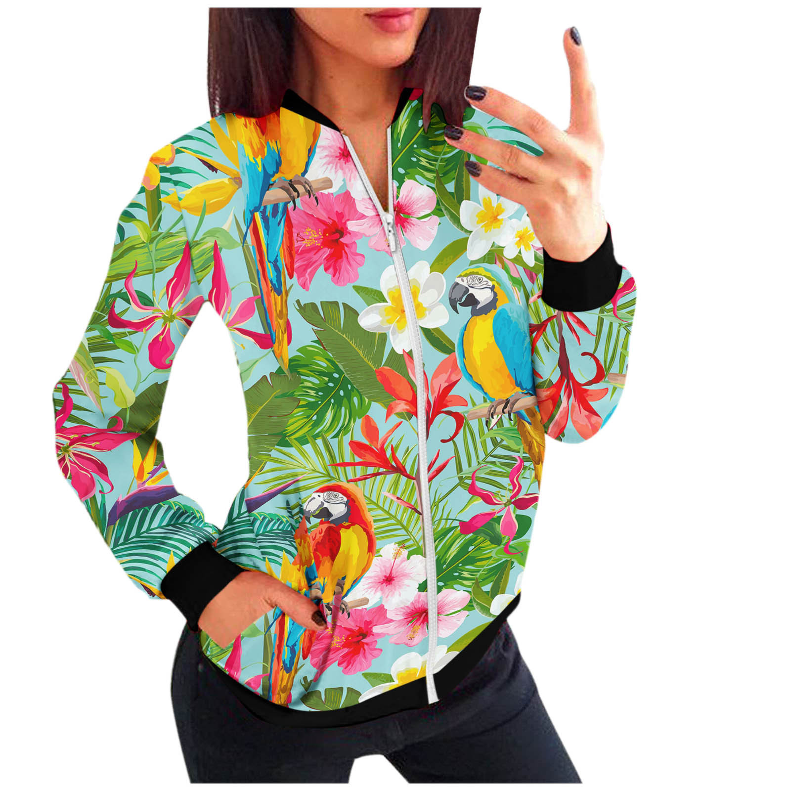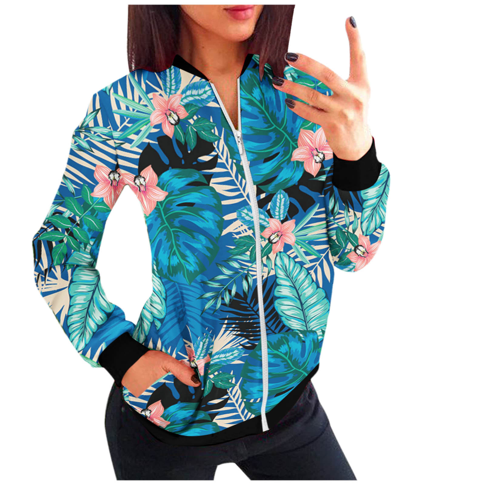 Womens Ladies Retro Floral Printing Zipper Up Jacket Casual Tops Coat Outwear