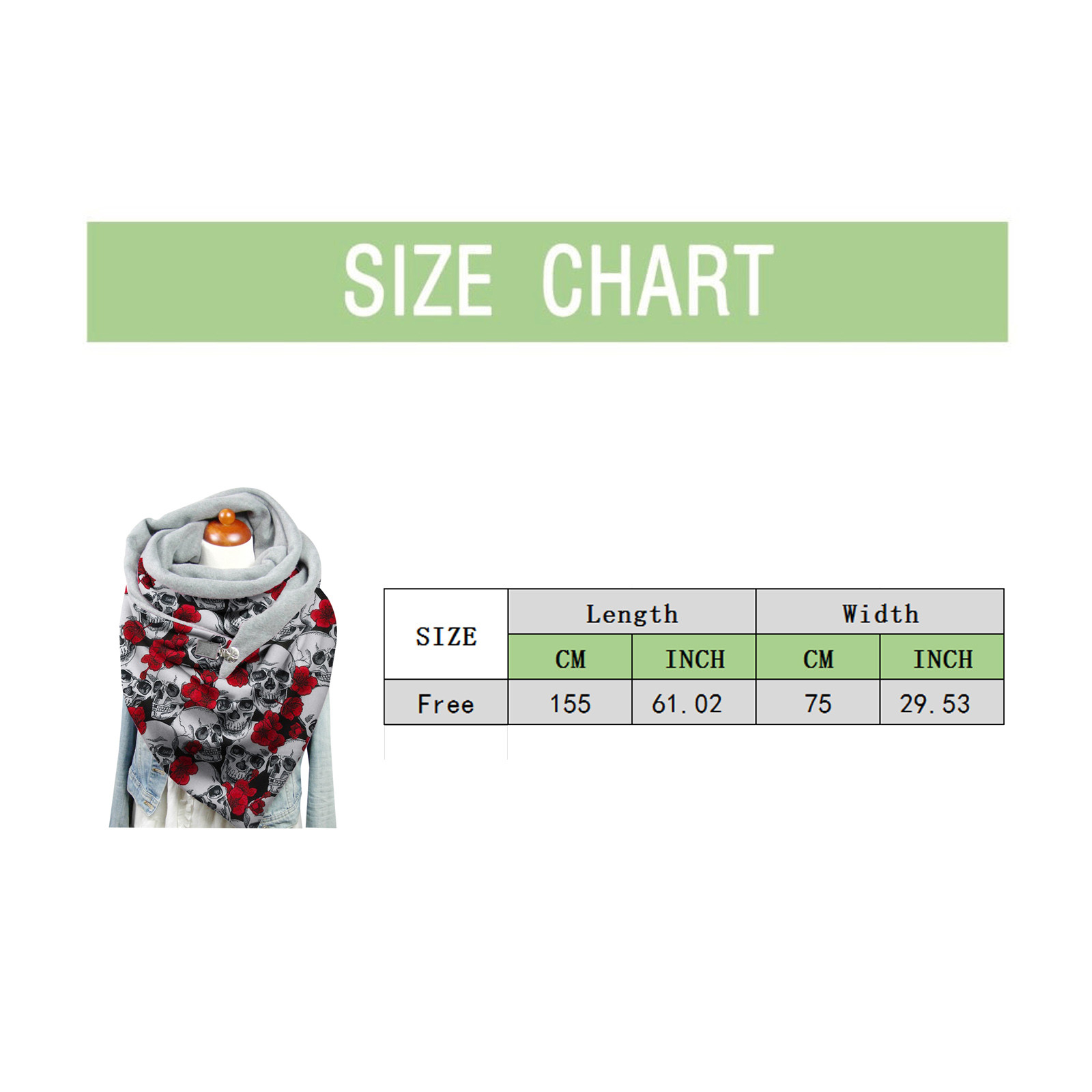 Размеры Длина Ширина Свободный размер 155 см/61,02 дюйма 75 см/29,53 дюйма