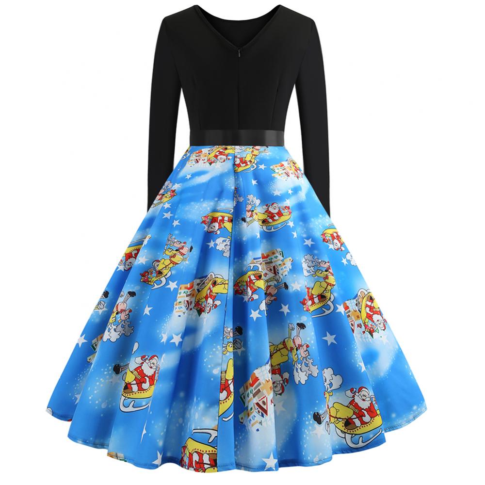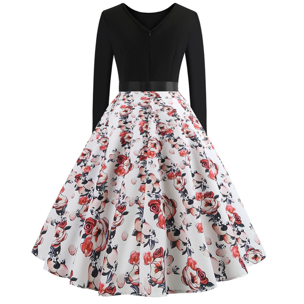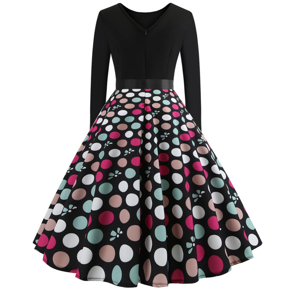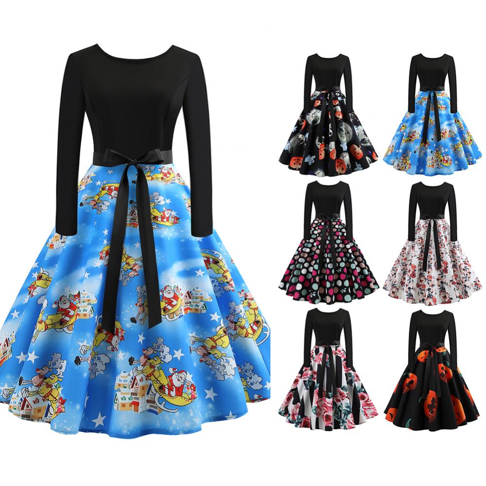 Элегантное платье в горошек с изображением цветов/Санта-Клауса/тыквы в стиле ретро.