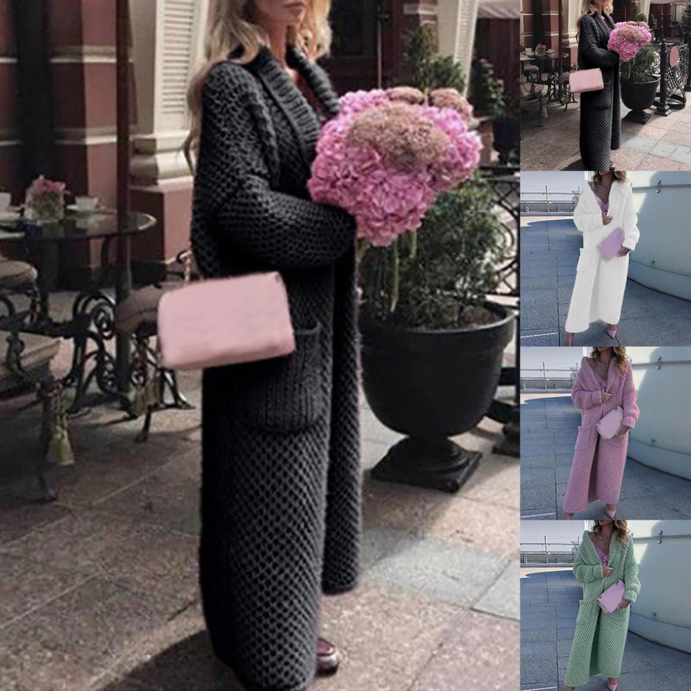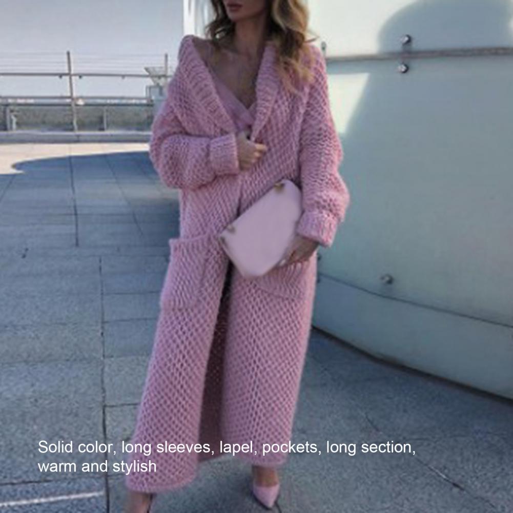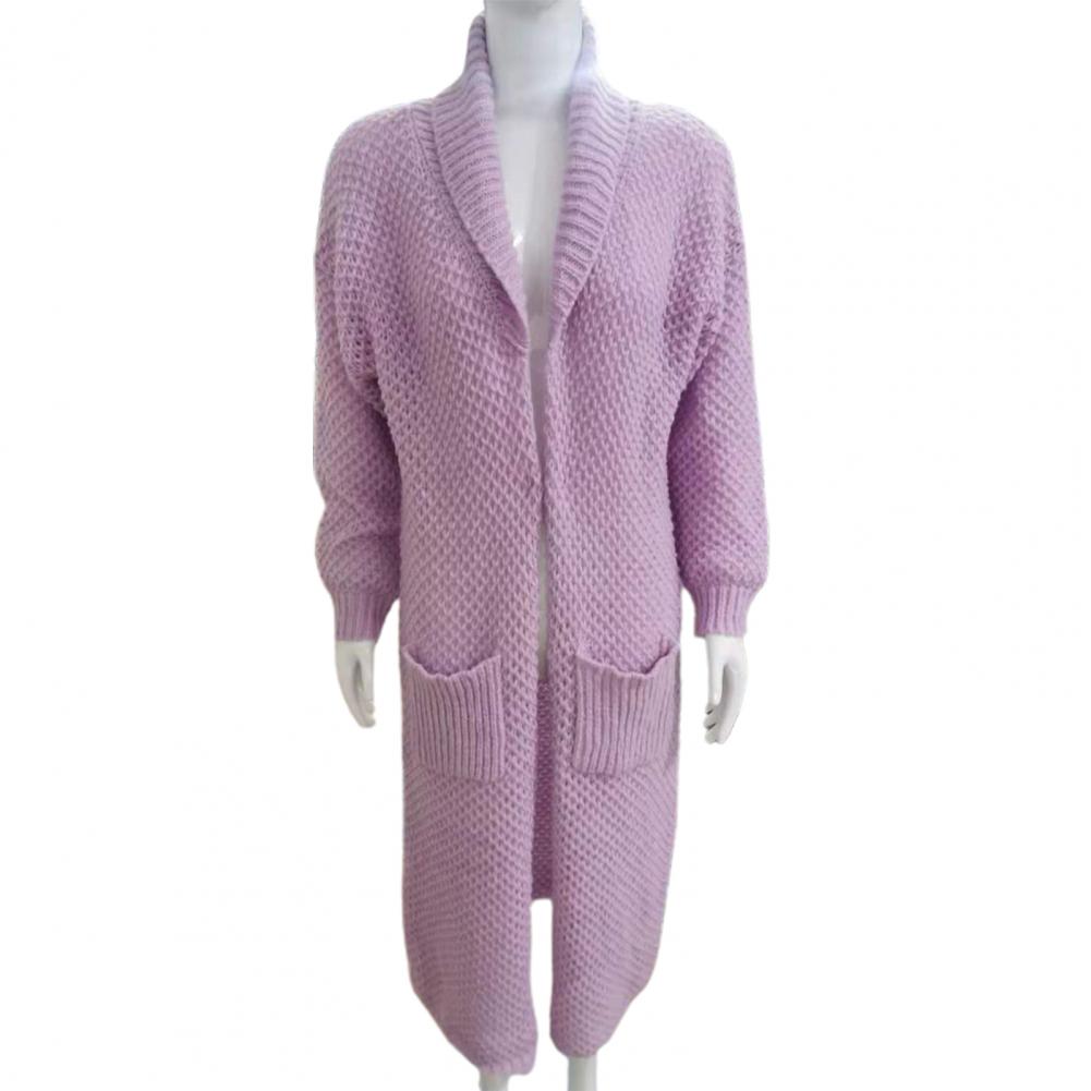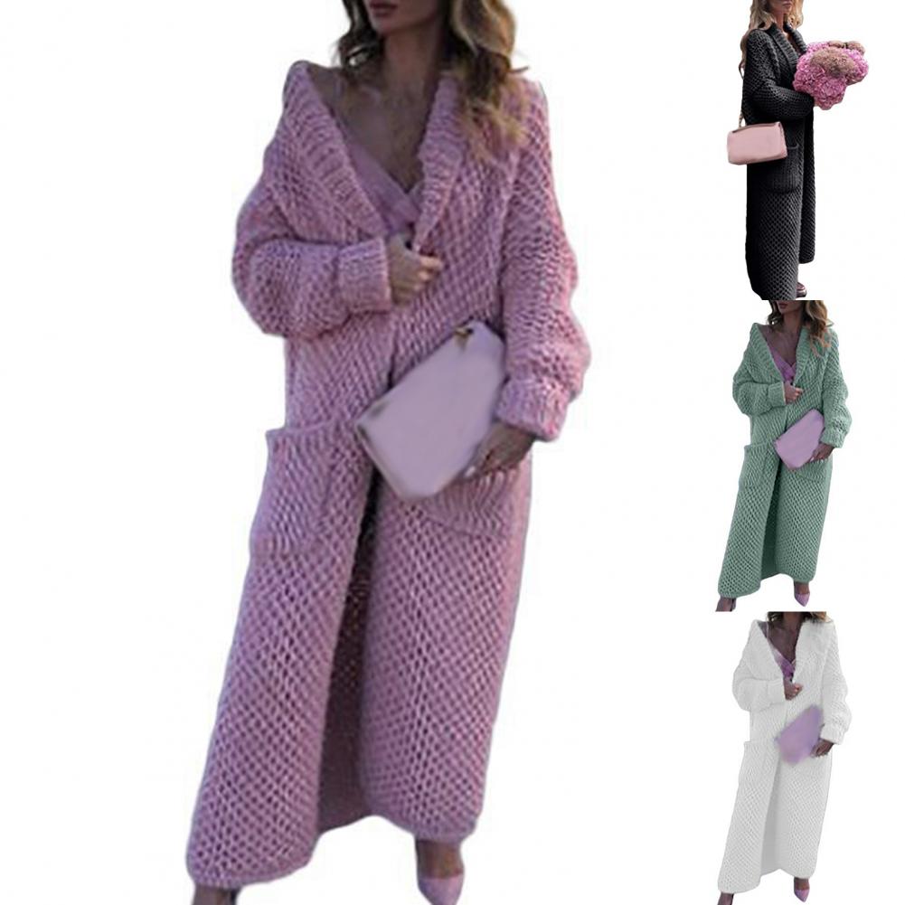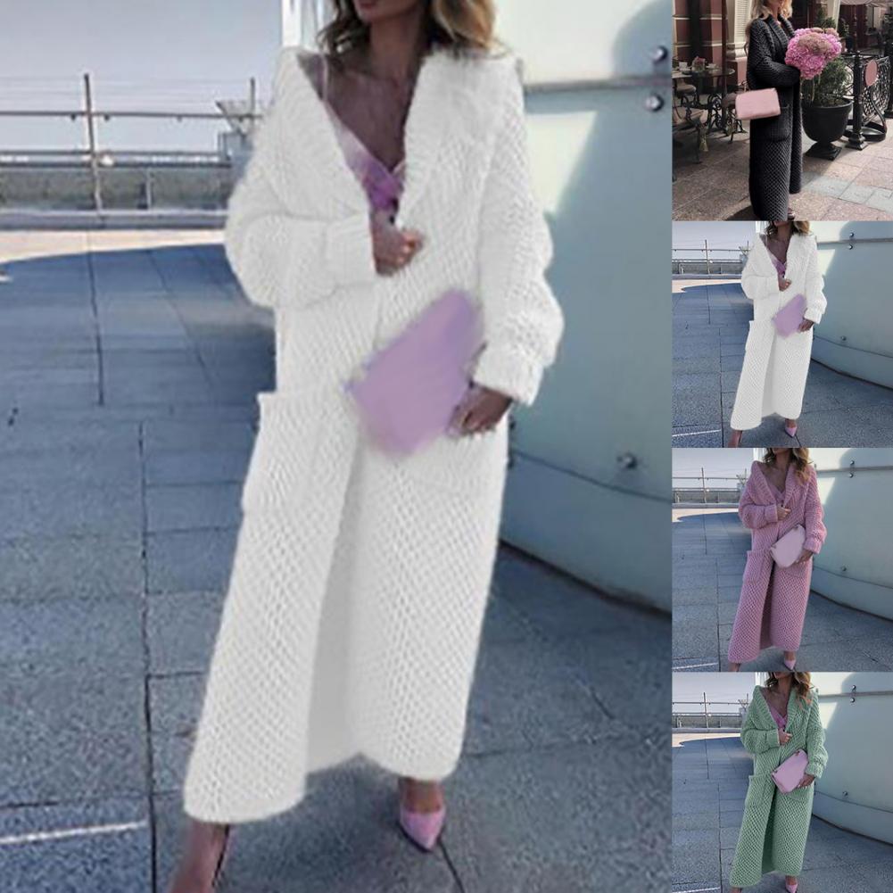 Женский Повседневный свитер, пальто, длинный кардиган, однотонный жакет с карманами, Осень-зима, отворот, длинный рукав, теплый свитер, куртка, уличная одежда