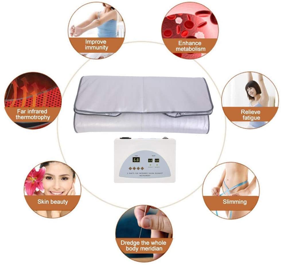 Через контроллер для регулировки температуры от 35 до 75 градусов Цельсия, время может быть настроено от 15 до 60 мин. Два зоны для похудения одеяло делают переднюю и заднюю часть тела для потери веса и детоксикации. Аккумулятор не входит в комплект дистанционного управления