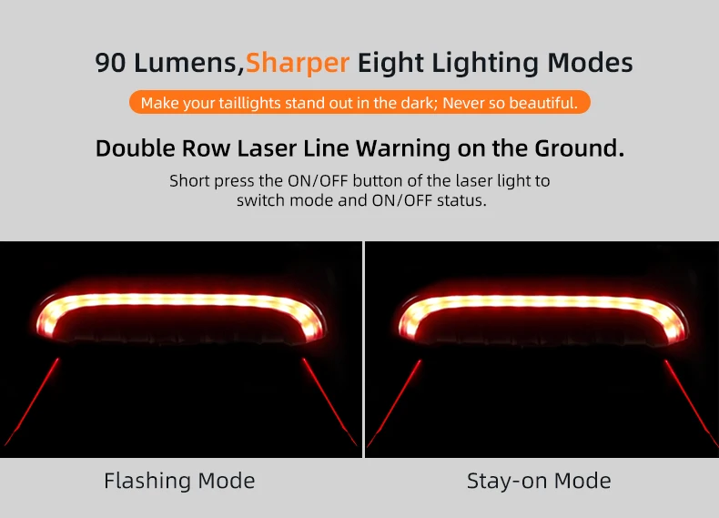 4. Автоматическое обнаружение тормозов, при торможении задний фонарь автоматически мигает, чтобы предупредить приближающихся к вам транспортных средств, чтобы гарантировать безопасную езду.