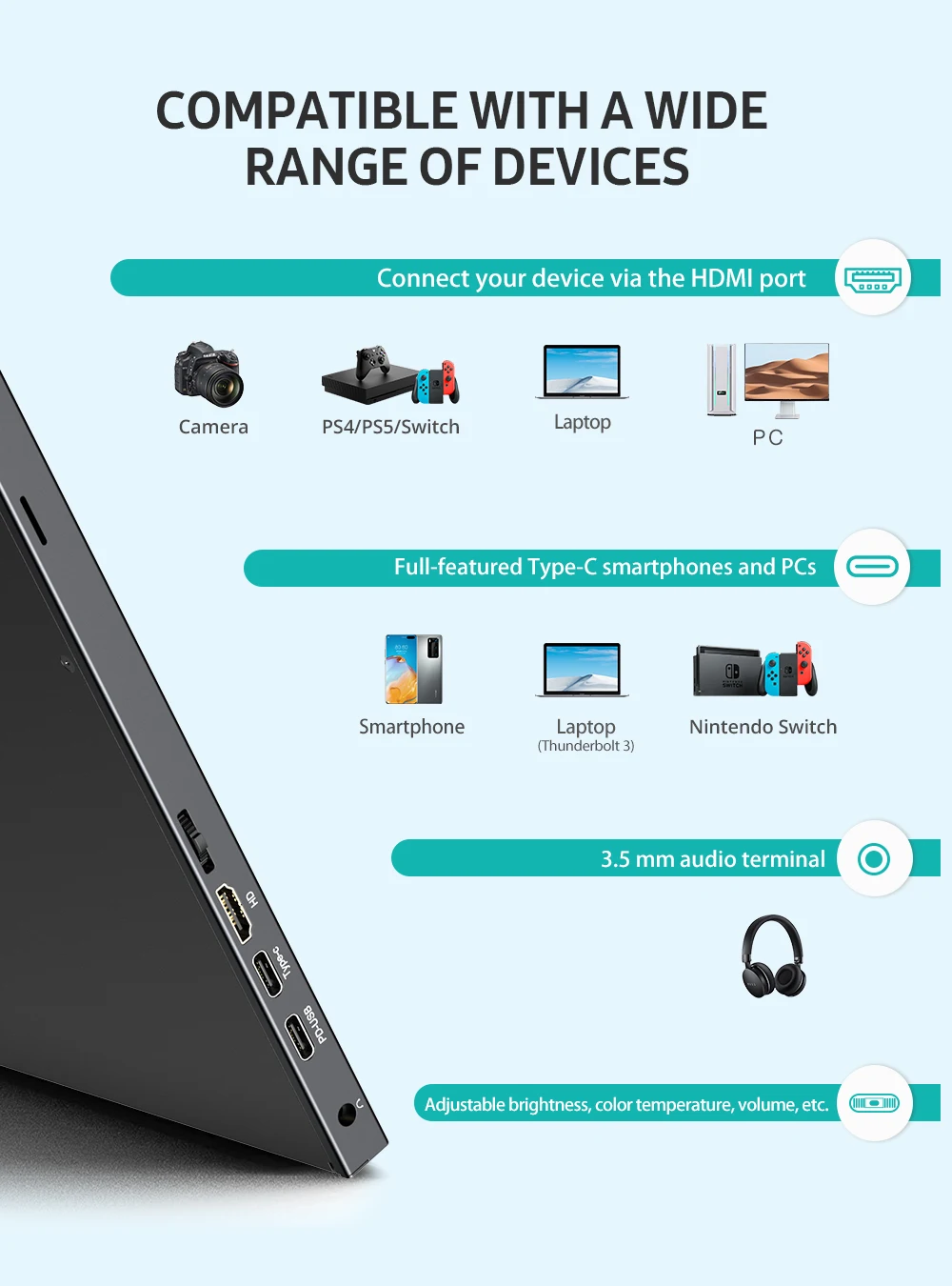 1. Этот портативный монитор без сенсорной функции, без встроенной батареи.