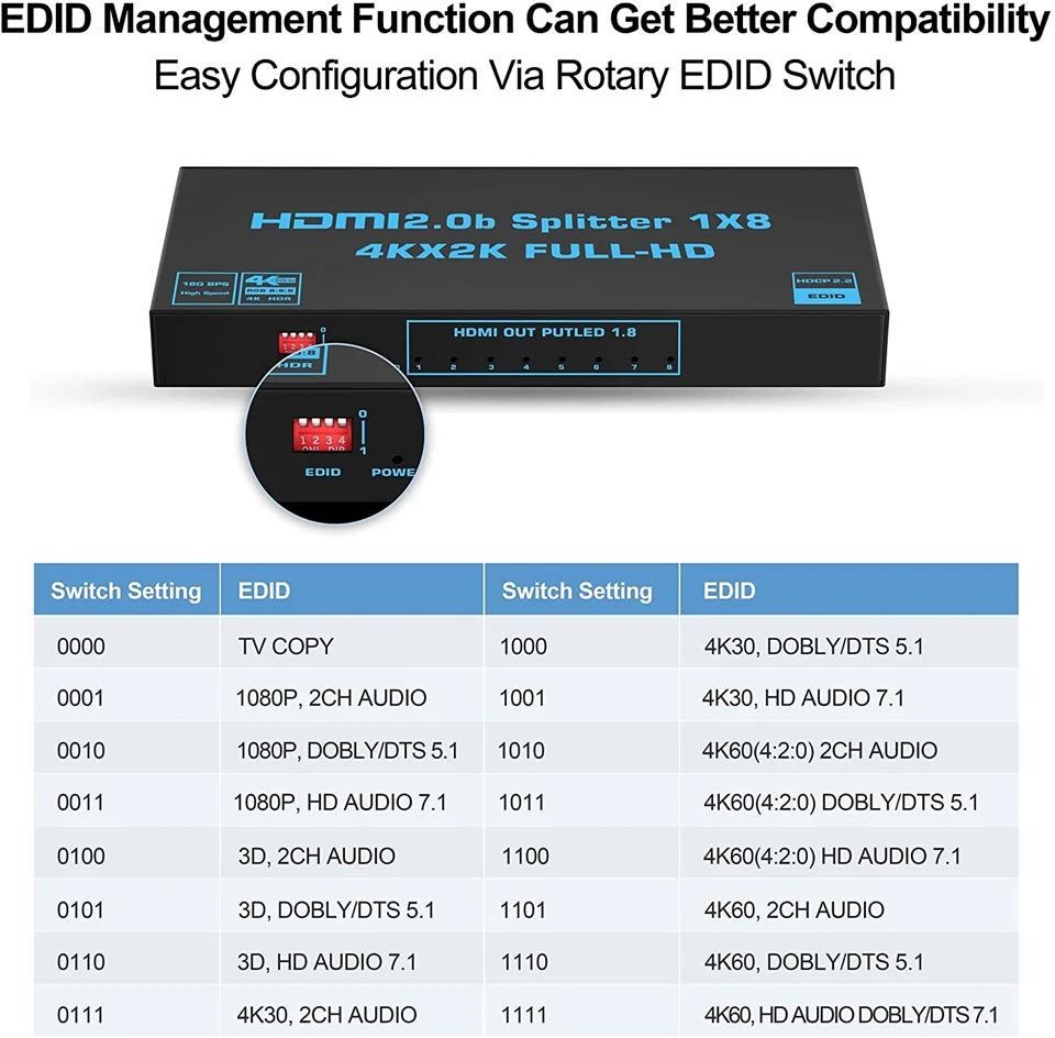 ★【HDMI 2. Спецификация 0b compliant】 наш сплиттер HDMI 2.0b поддерживает до 4K x 2K при 60Hz YUV4:4:4, HDR 4K(RGB 4:4:4),Ultra HD/3D; поддерживает HDCP2.2 с пропускной способностью 18 Гбит/с и глубоким цветом 30/36 бит. (Примечание: Если ваш Телевизор поддерживает только YUV 4:2:0, даже если ваш Телевизор поддерживает 4K, телевизор фактически отображает 1080P, а не 4k)