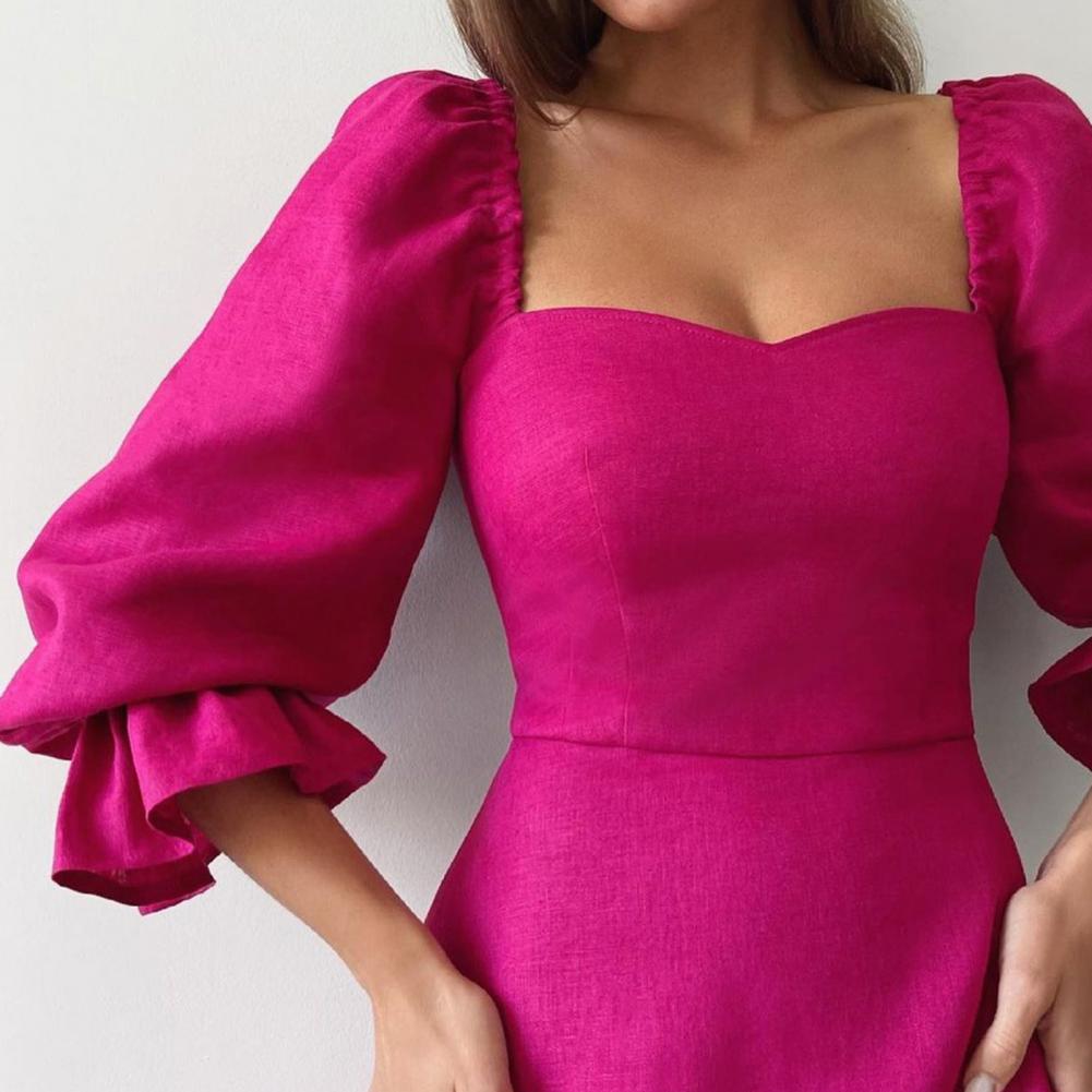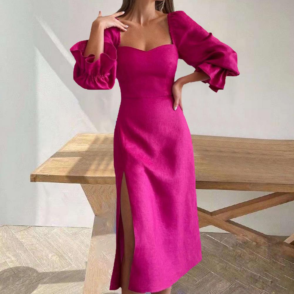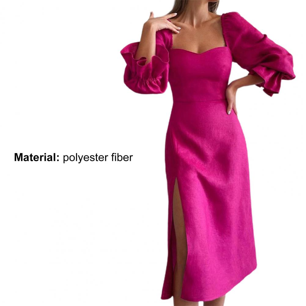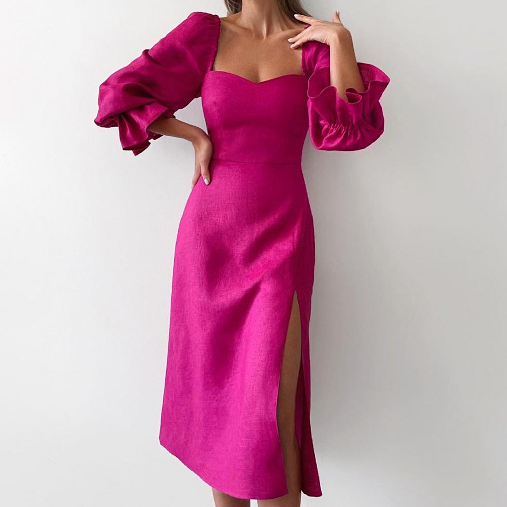 Женское платье с квадратным воротником и пышным рукавом, осеннее платье-трапеция с разрезом сбоку, розовое красное платье средней длины, уличная одежда