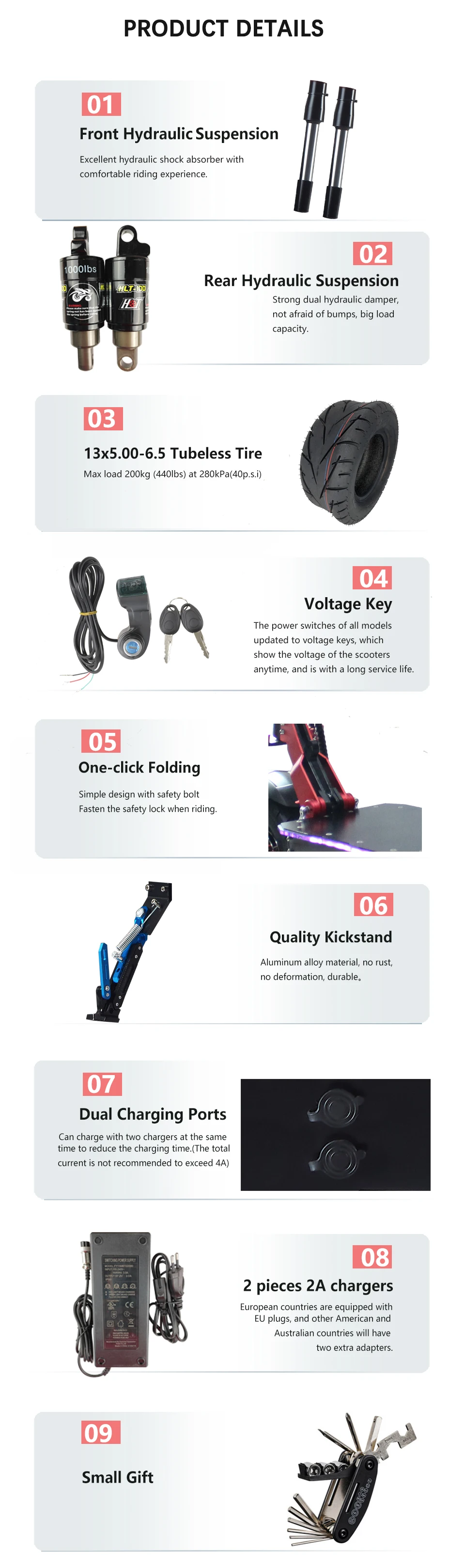 A: T111-это двойной привод 60 в, с мотором 60 в 2800 Вт, батареей 18650 23.4Ah/30Ah/35Ah/40Ah, передняя и задняя гидравлическая подвеска, Высокий конец 62 см руль и подставка, большие шины.