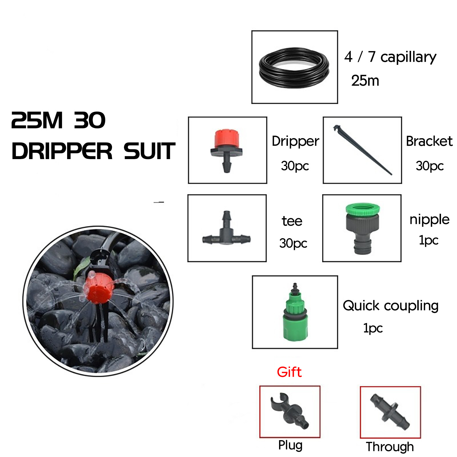 1x 4/7 капиллярная трубка 30x капельная насадка 30x держатель 30x тройник порт 1x соска 1x Быстрый разъем 1x штекер 1x прямой разъем