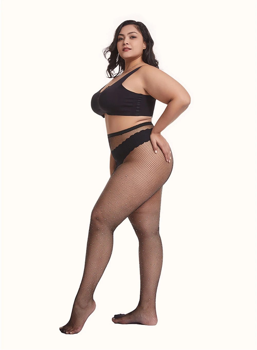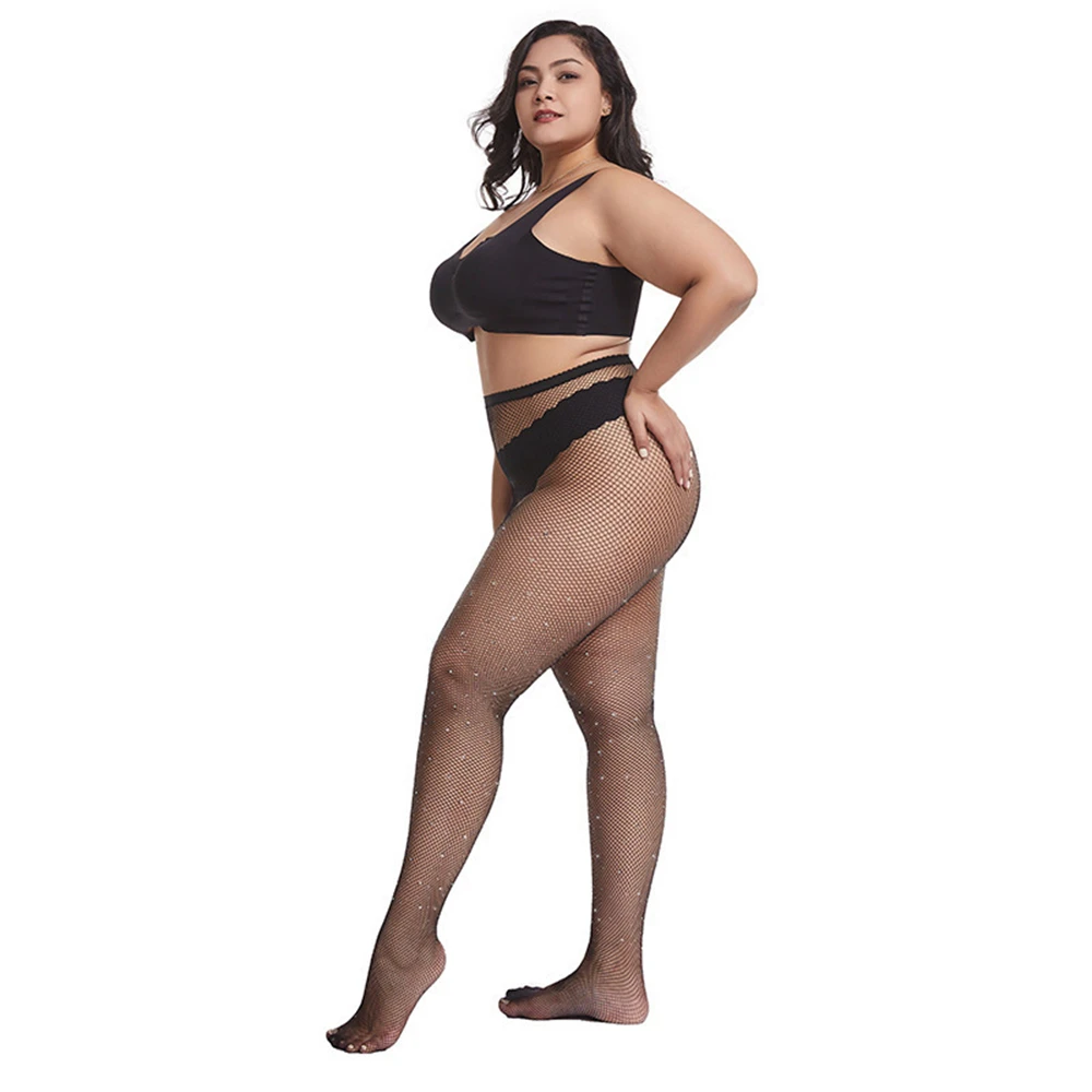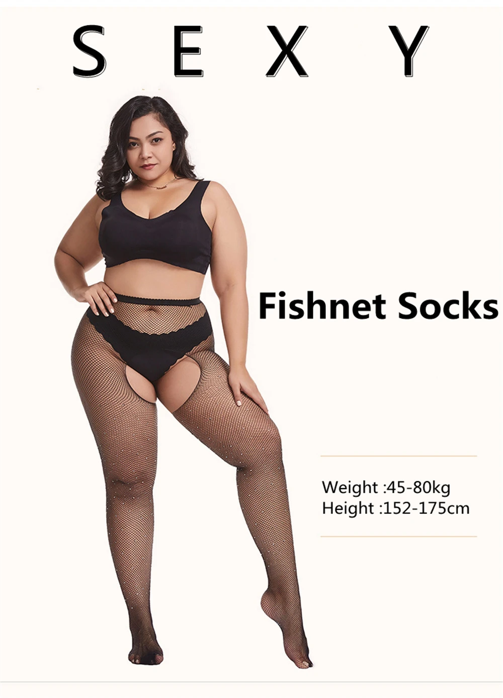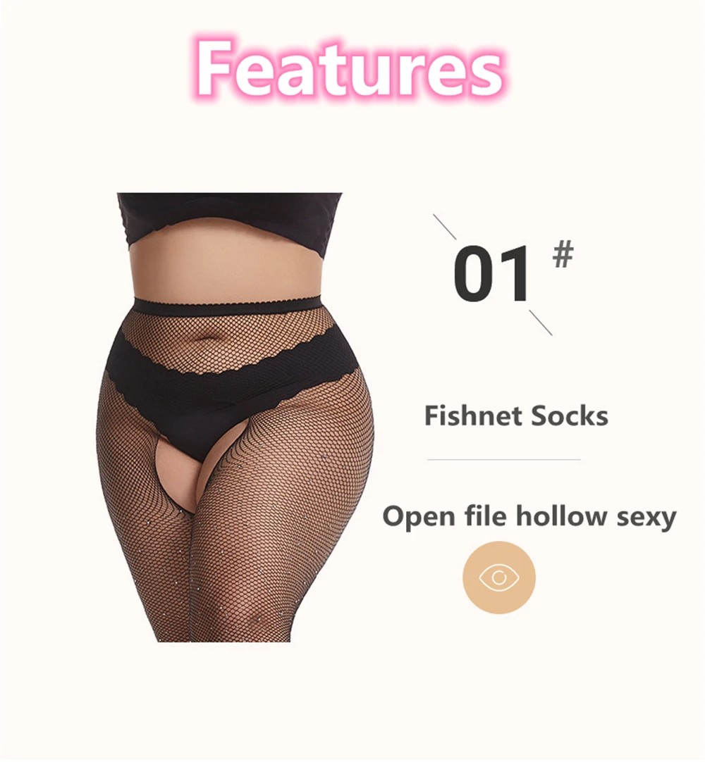 Черные женские ажурные колготки с открытым шаговым швом и блестящей алмазной сеткой, очень эластичные колготки большого размера