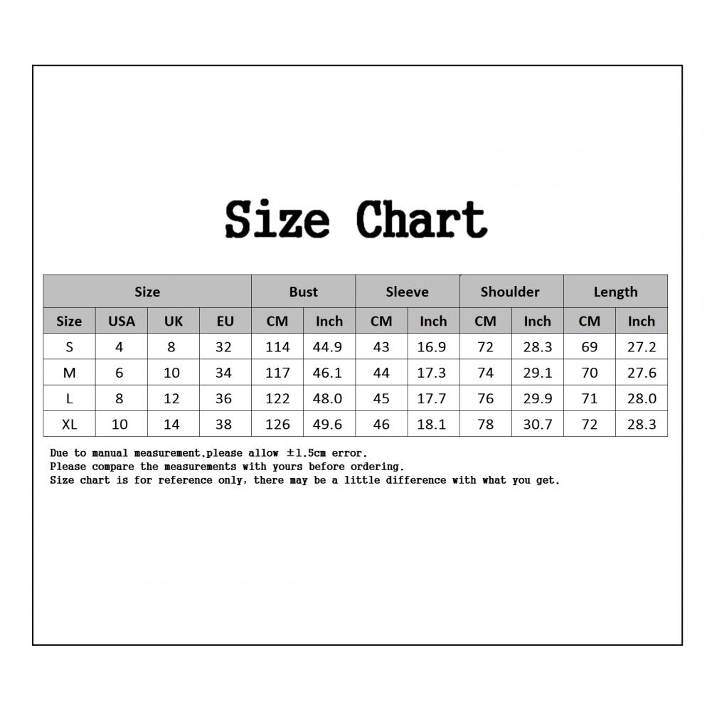 [Наш Размер L] Обхват груди: 122 см/48 ", рукав: 45 см/17,7", ширина плеч: 76 см/29,9 ", Длина: 71 см/28" (прибл.)