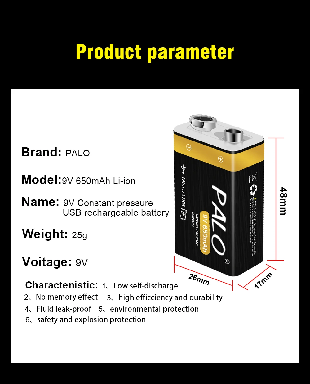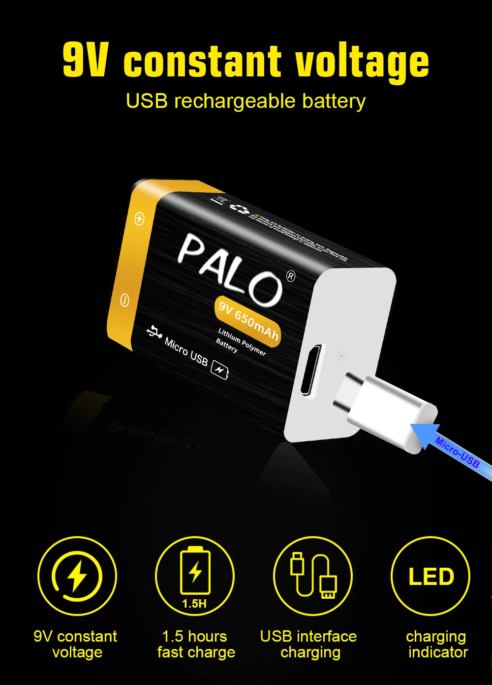 Тип: перезаряжаемая батарея USB 9V 650mah
