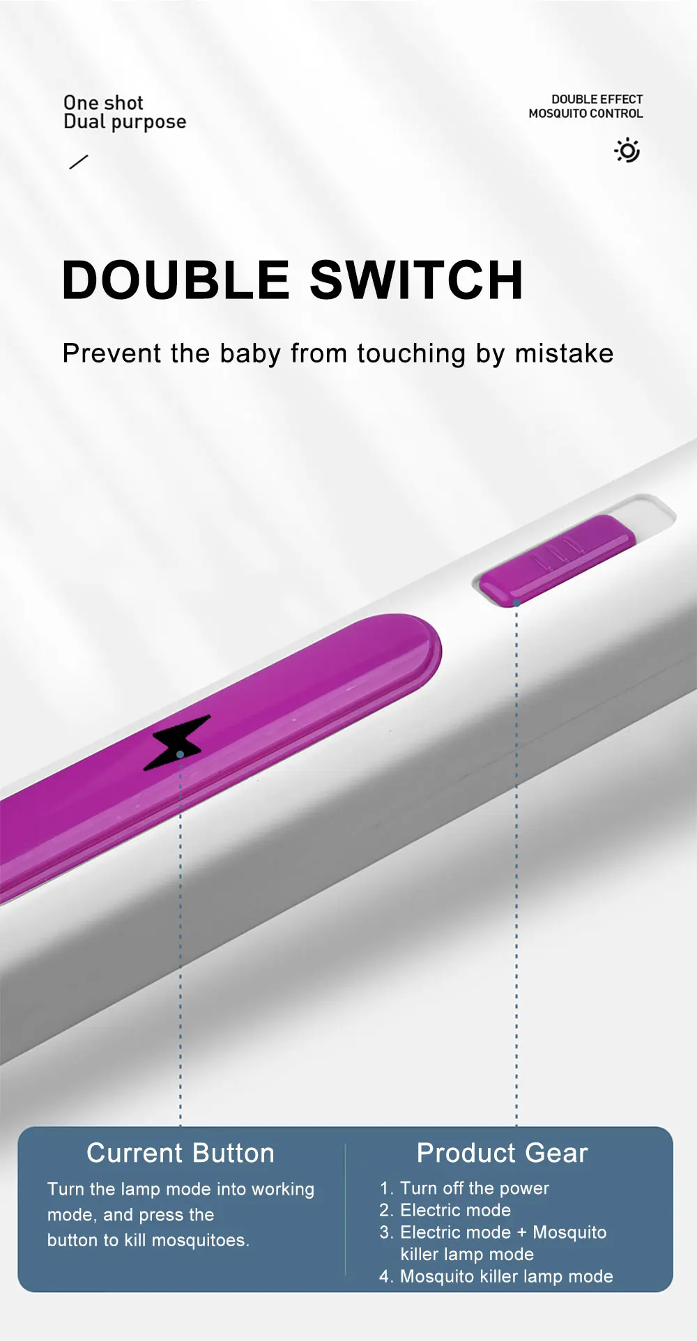 Когда режим включен, вам нужно нажать кнопку электрошока, прежде чем Москитная щита будет включена. Защитите детей безопасно.
