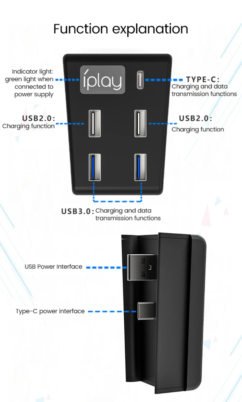 • Простота в использовании: вставьте два порта питания в соответствующие порты USB-A и TYPE-C хоста.