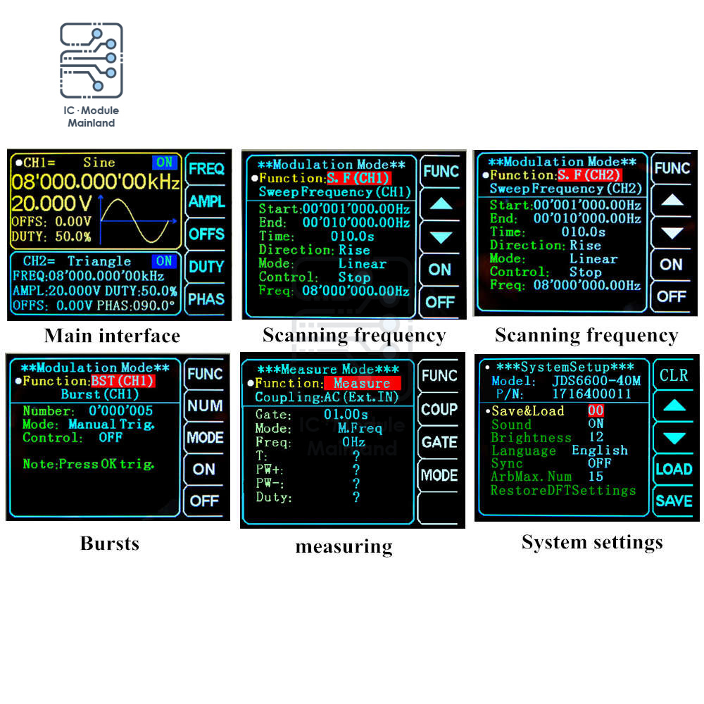 -1. Принять 320*240 2,4 ''TFT цветной ЖК-дисплей, одновременно отображать параметры CH1 и CH2, возможность воспроизводить шаблоны пользовательской формы волны.