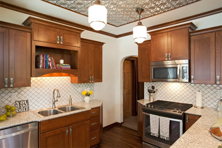 Антикварные дешевые Заказные коричневые твердые деревянные 3D кухонные шкафы для маленькой кухни, сделанные в Китае