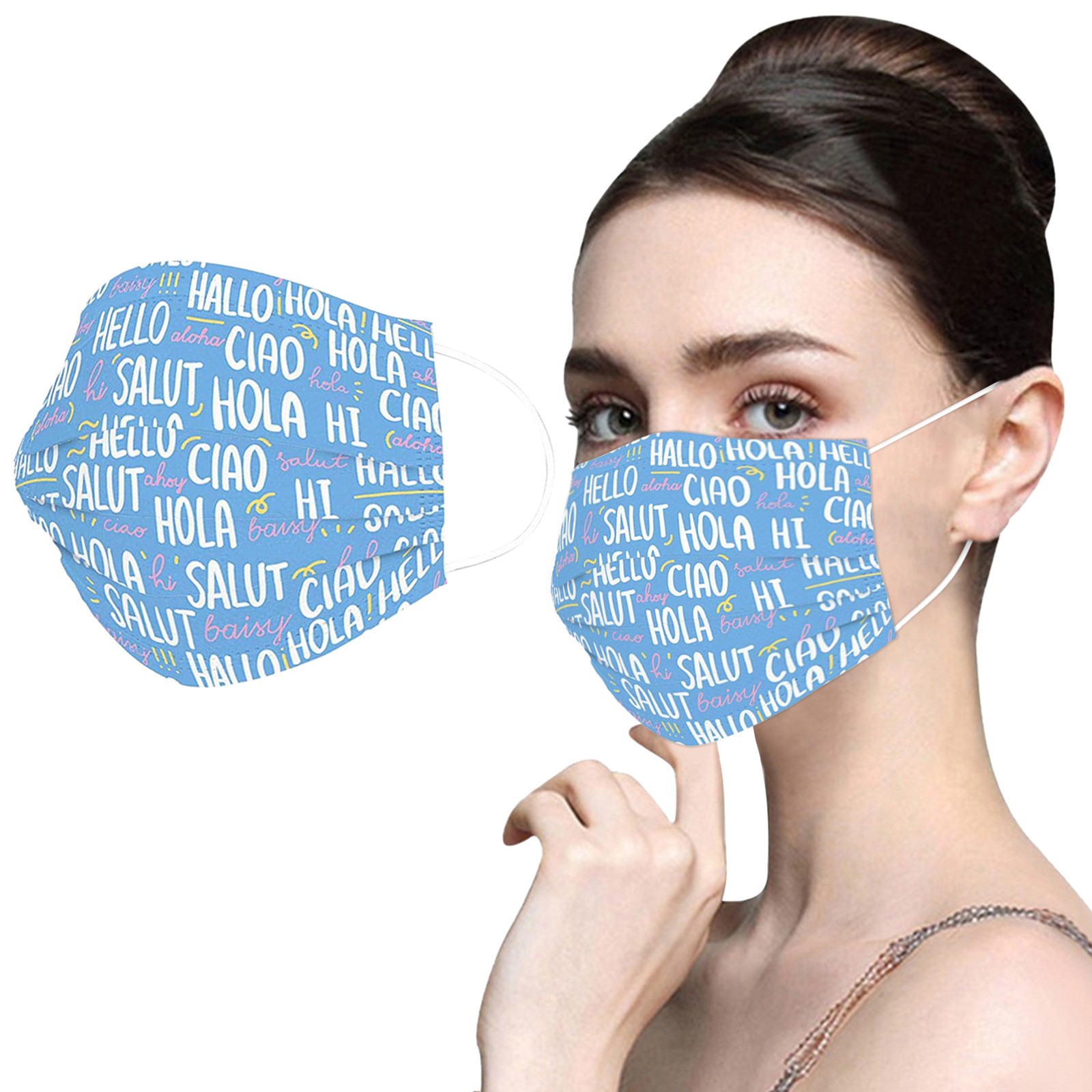 Одноразовая маска изготовлена из 3 слоев нетканого материала, который является здоровым и безопасным в использовании. Дышащие материалы и красивые узоры практичны и стильны. Специальный трехслойный нетканый материал обеспечивает определенную защиту от пыли, выхлопных газов автомобиля, пыльцы и т. д. эластичные крючки для ушей, легко носить, без давления на уши.