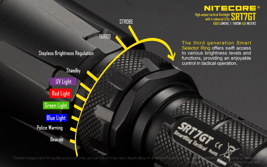 The SRT7GT is operated using a rubber tailcap switch and Nitecore's patented Smart Selector Ring, a one-of-a-kind operating system that allows for optimal functionality and customization. The dial-like switch rotates around the light's body allowing for seamless switching between different outputs, including a tactical strobe, a location beacon, and a special blue and red police warning flash. The selector ring also provides adjustable brightness for its main CREE LED, allowing for free adjustment anywhere between 0.1 and 1000 Lumens. Thanks to its incredible versatility, the SRT7GT is able to provide lighting for just about any situation.