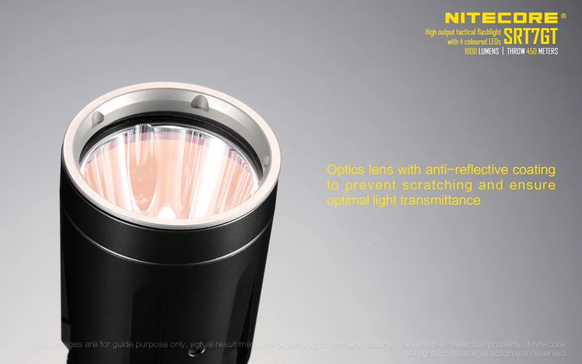 From police officers, to hunters, to first responders, the Nitecore SRT7GT LED Flashlight is the perfect light for all tactical users. Powered by a single 18650 battery or a pair of CR123A batteries, this potent torch is capable of producing 1000 Lumens of radiant white light thanks to its sophisticated CREE XP-L HI V3 LED. The SRT7GT features a smooth aluminum reflector, which combined with the light's Crystal Coating Technology allows its beam to throw nearly 1500 feet away; that's nearly 5 football fields! In addition to its CREE LED, this versatile light sports 4 secondary colored LEDs (Red, Blue, Green, and Ultraviolet) that can be used for a number of tactical purposes. The Red LED helps preserve a person's natural night vision, perfect for a variety of nighttime activities. The Blue and Green LEDs are ideal for hunters and sportsmen, while the Ultraviolet LED can be useful for everything from police work to currency inspection.