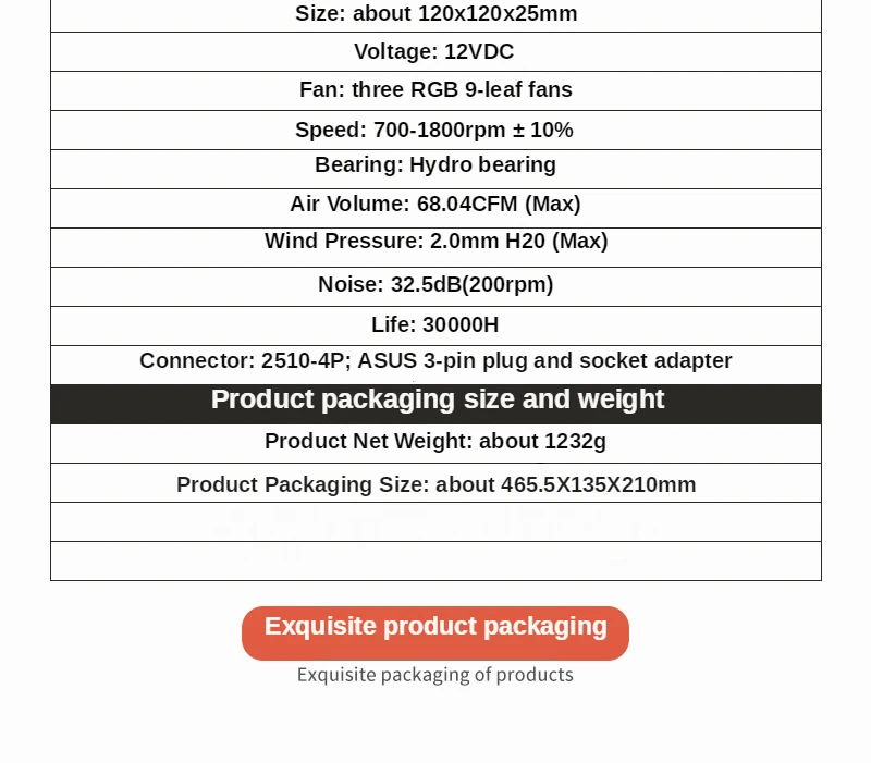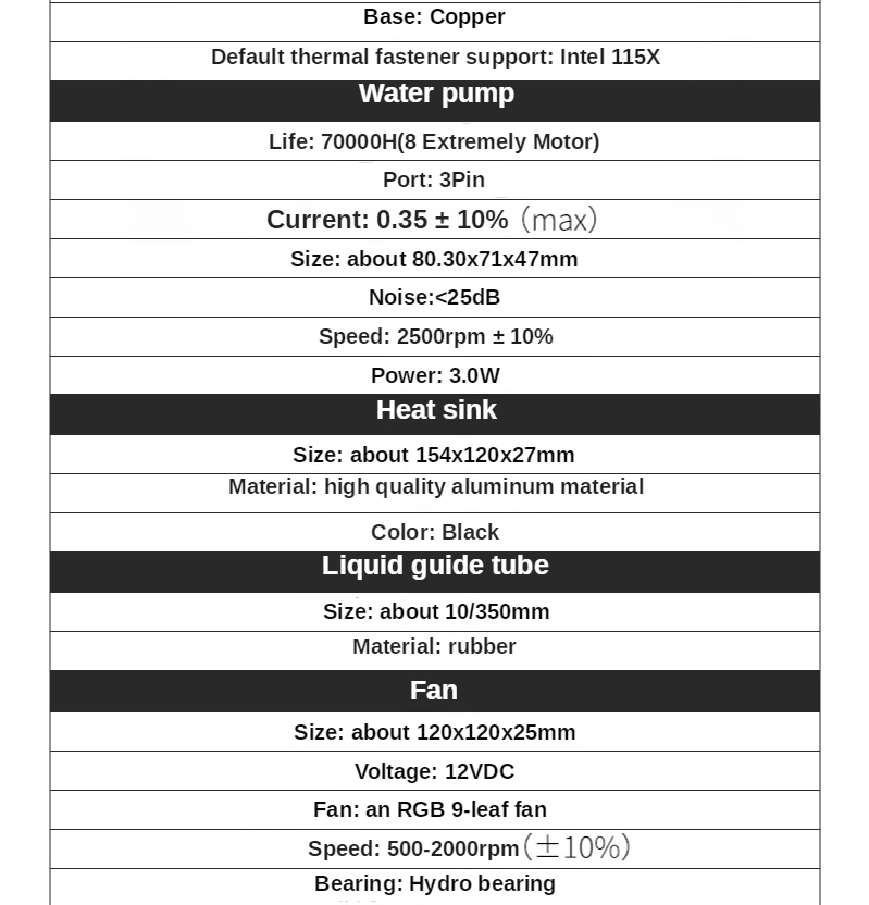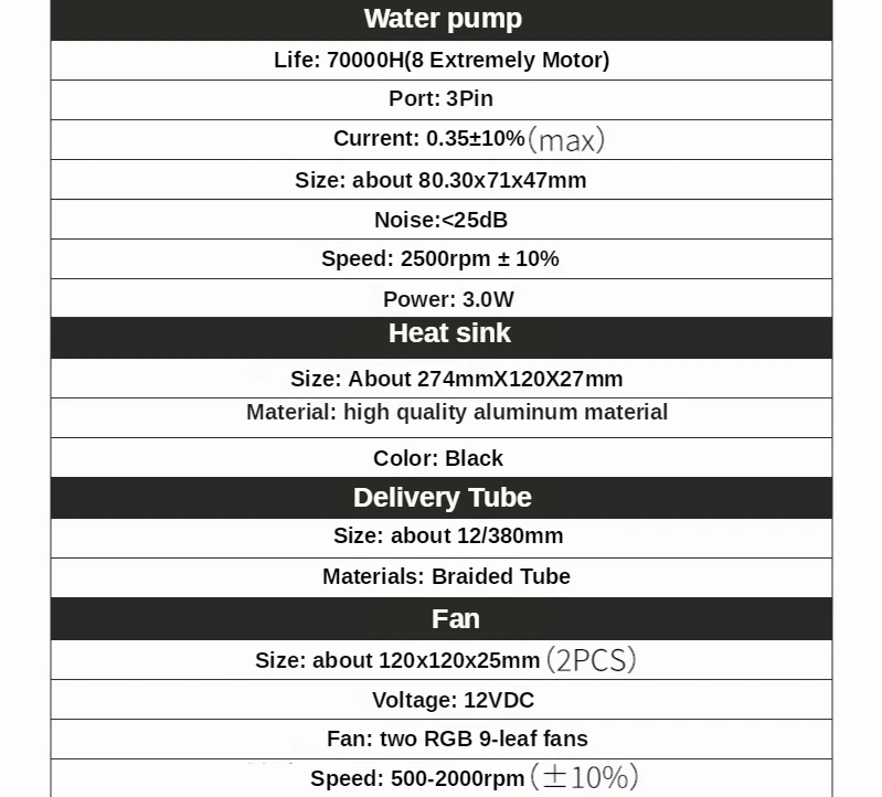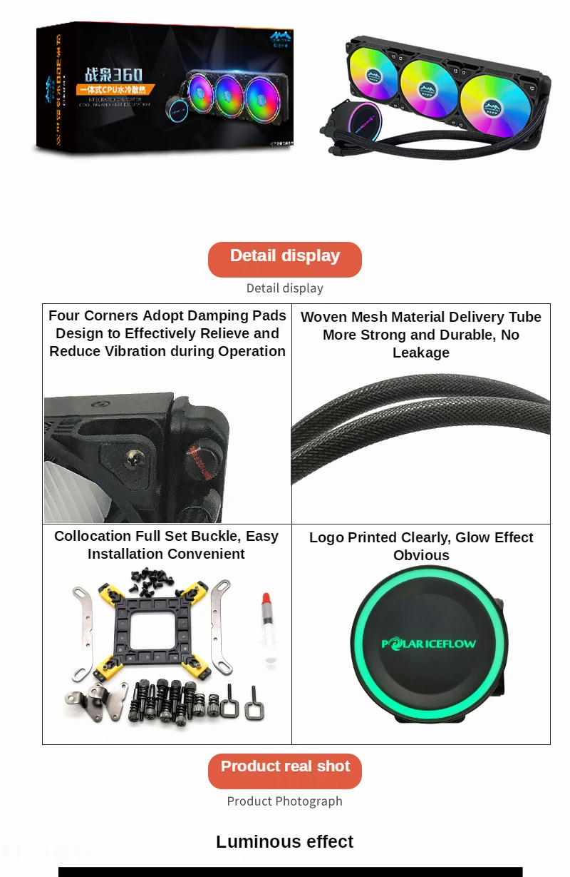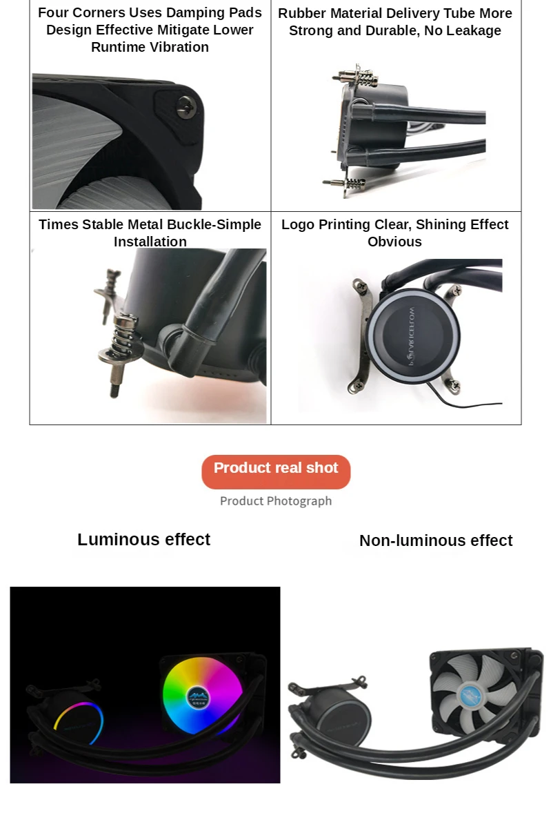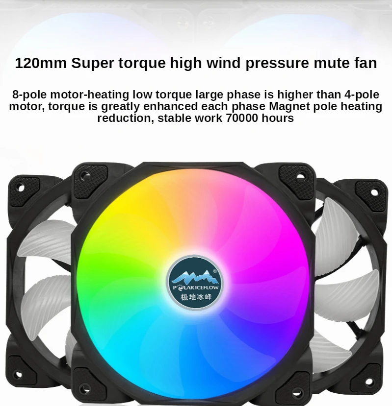 (1) Cold head RGB non-conductive water-cooled liquid, pure copper bottom heat dissipation, intelligent temperature control and speed regulation