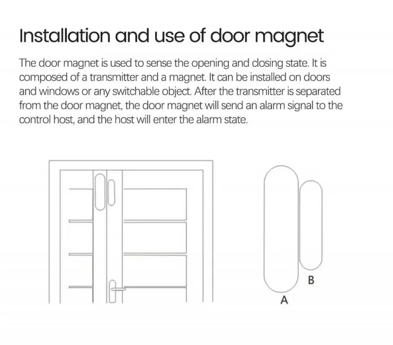 Датчик двери используется для определения состояния открытия и закрытия. Он состоит из передатчика и магнита. Он может быть установлен на двери, окна или любые предметы, которые могут быть открыты и закрыты. После того, как передатчик и датчик двери будут разделены, датчик двери отправит сигнал тревоги на хост управления, и хост входит в состояние тревоги
