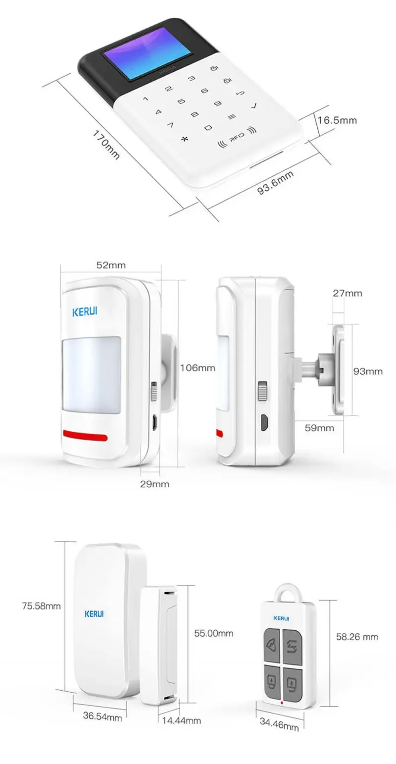 1*2G сигнализация, 1 пара датчиков двери, 1 * Инфракрасный датчик, 2 * пульт дистанционного управления, 2 * RFID карта, 1 * линия питания usb