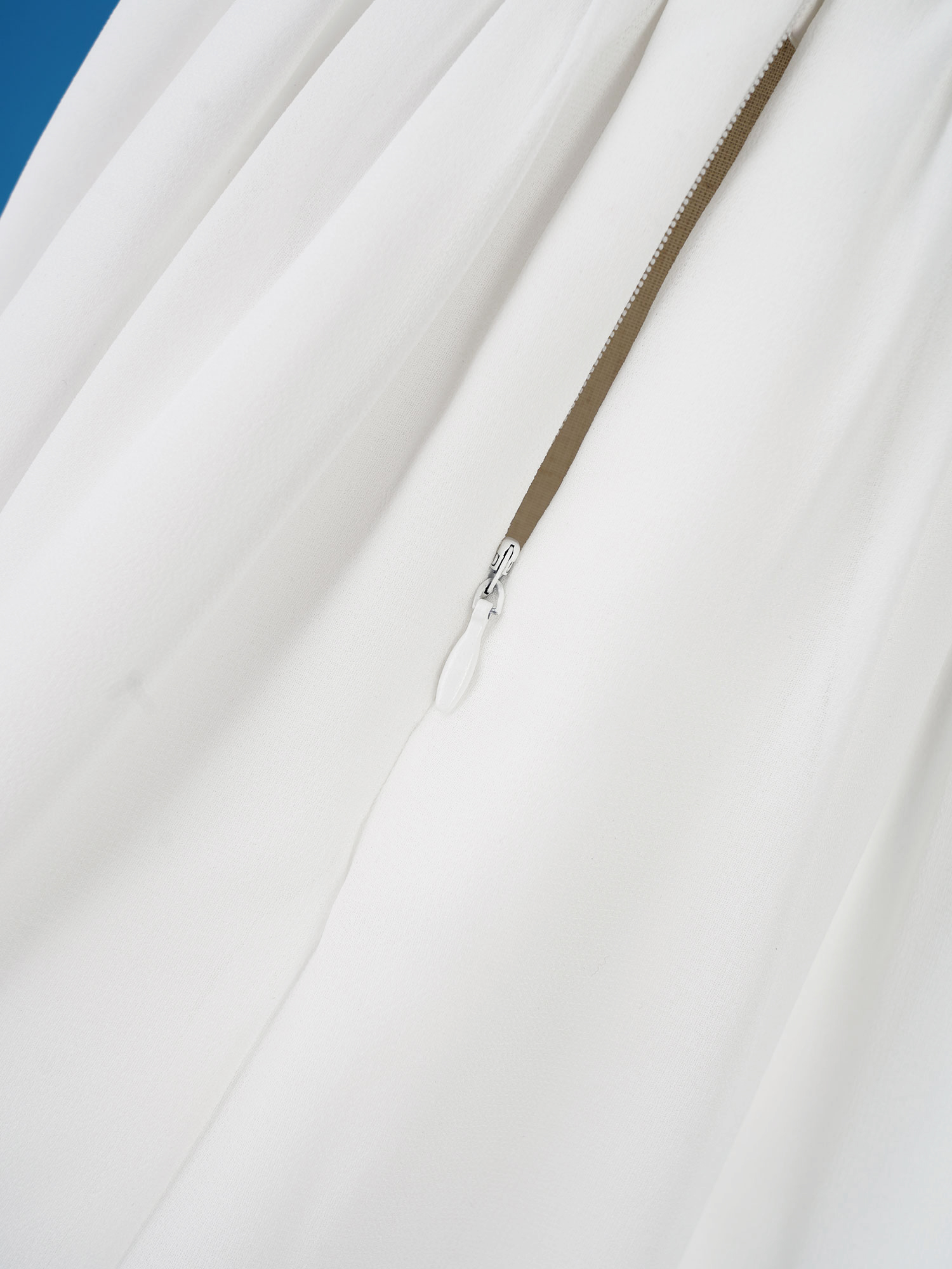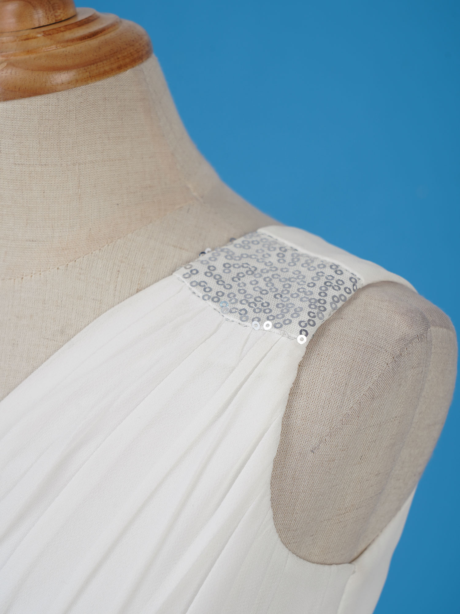 Однотонное платье без рукавов, с v-образным вырезом, блестящими пайетками на плечах и на талии спереди, высокой талией и пышным шифоновым подолом, на шнуровке и на молнии сзади.