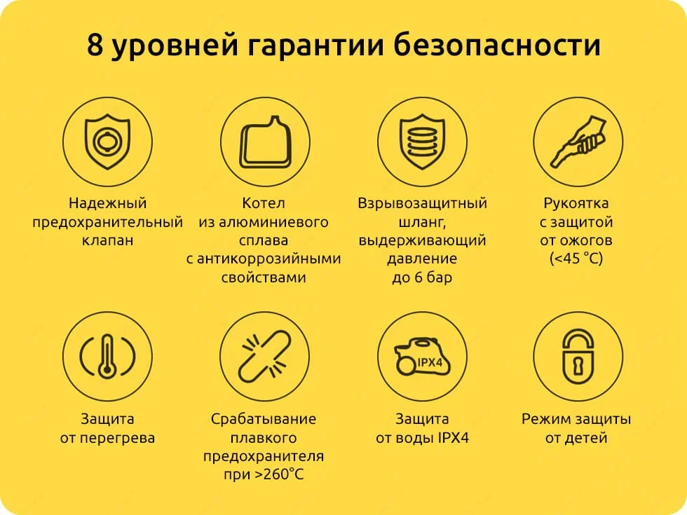Надежный предохранительный клапан; Котел из алюминиевого сплава с антикоррозийными свойствами; Взрывозащищенный шланг, который может выдерживать давление до 6 бар; Ручка с защитой от УФ-излучения.