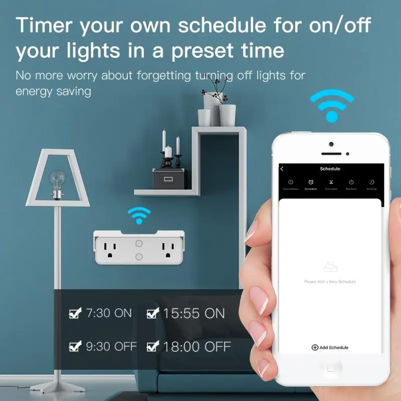 4. 【Гибкий schedule】 таймер вашего графика в приложении Smart Life для ваших двух подключенных устройств независимо без помех, чтобы задать время включения/выключения и даже с опцией обратного отсчета для более гибкого управления; Кроме того, он разработан с новыми обновлениями как случайные, Циркулирующие и вставляемые настройки.