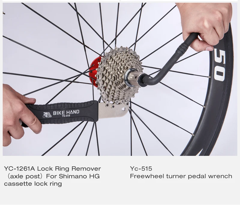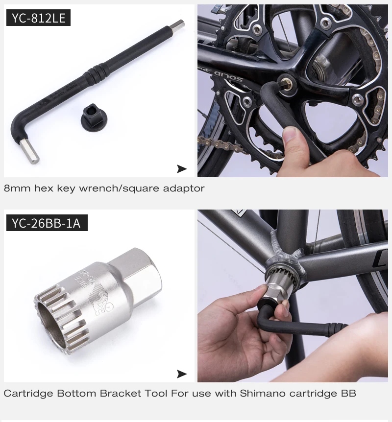 * Педальный ключ (YC-658-15S-4T), 8 мм шестигранный ключ/квадратный адаптер (YC-812LE), индикатор износа цепи (YC-503), Фристайл Тернер/педаль гаечный ключ (YC-515), нижний кронштейн гаечный ключ, для Hollowtech II BB, BB-9000, BBR60 (YC-307BB), цепное устройство для извлечения заклепок (YC-324SC), отвертка с плоским/Phillips (YC-611), шестигранный ключ 2/2.5/3/4/5/6 мм (YC-613)