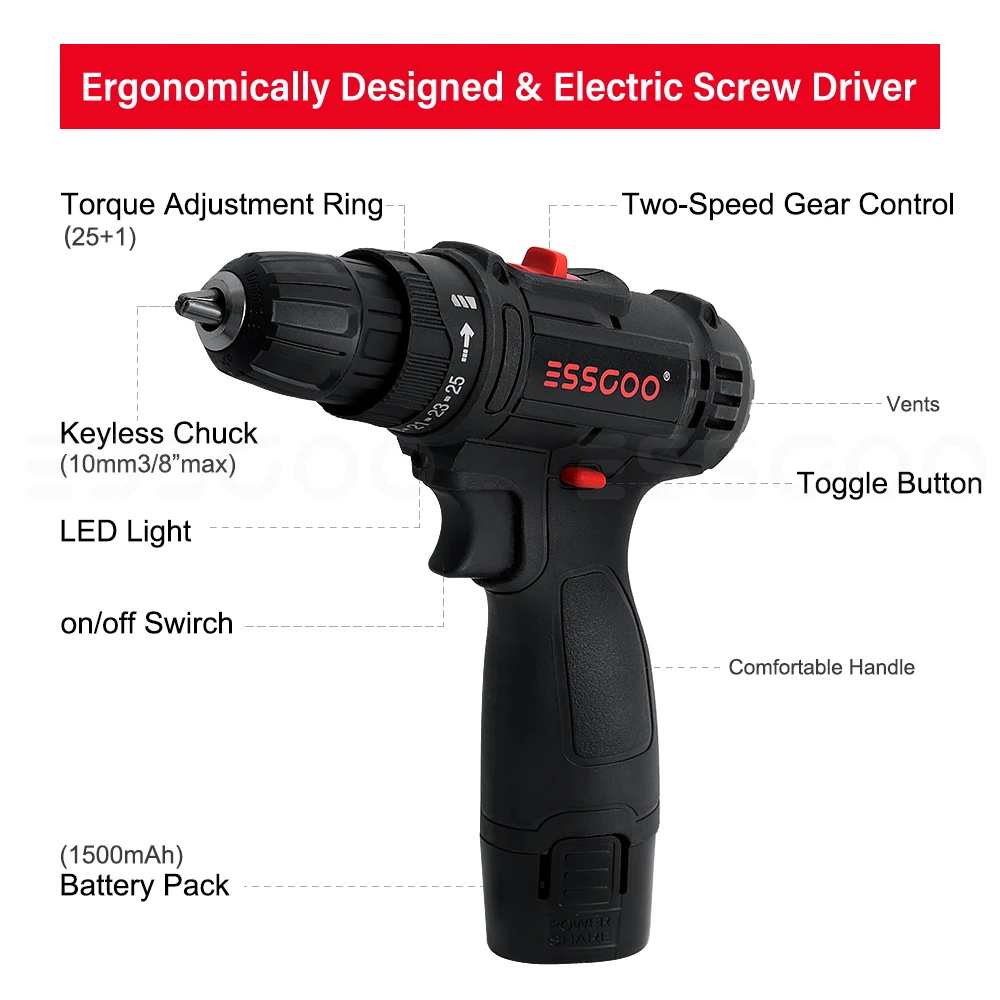 ESSGOO 12V Беспроводная электрическая дрель 1500mAh батарея Отвертка Набор мини беспроводной отвертка питания домашний портативный ремонтный инструмент Домашний DIY 10-30N.M