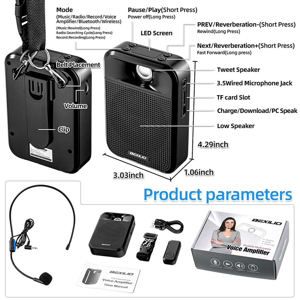 DEXILIO усилитель голоса с проводным/беспроводным микрофоном гарнитура, 10 Вт Портативный Перезаряжаемый динамик с системой PA с Bluetooth/MP3/FM радио, мини Громкий динамик для учителя/гида/обучения/на открытом воздухе[Беспроводной и проводной микрофон двойного назначения] Этот звуковой усилитель оснащен проводным микрофоном и беспроводным передатчиком. Пользователи могут выбрать беспроводные или проводные методы усиления в соответствии с их собственными потребностями и выбрать, носить ли усилитель на корпусе, что значительно облегчает пользователям.