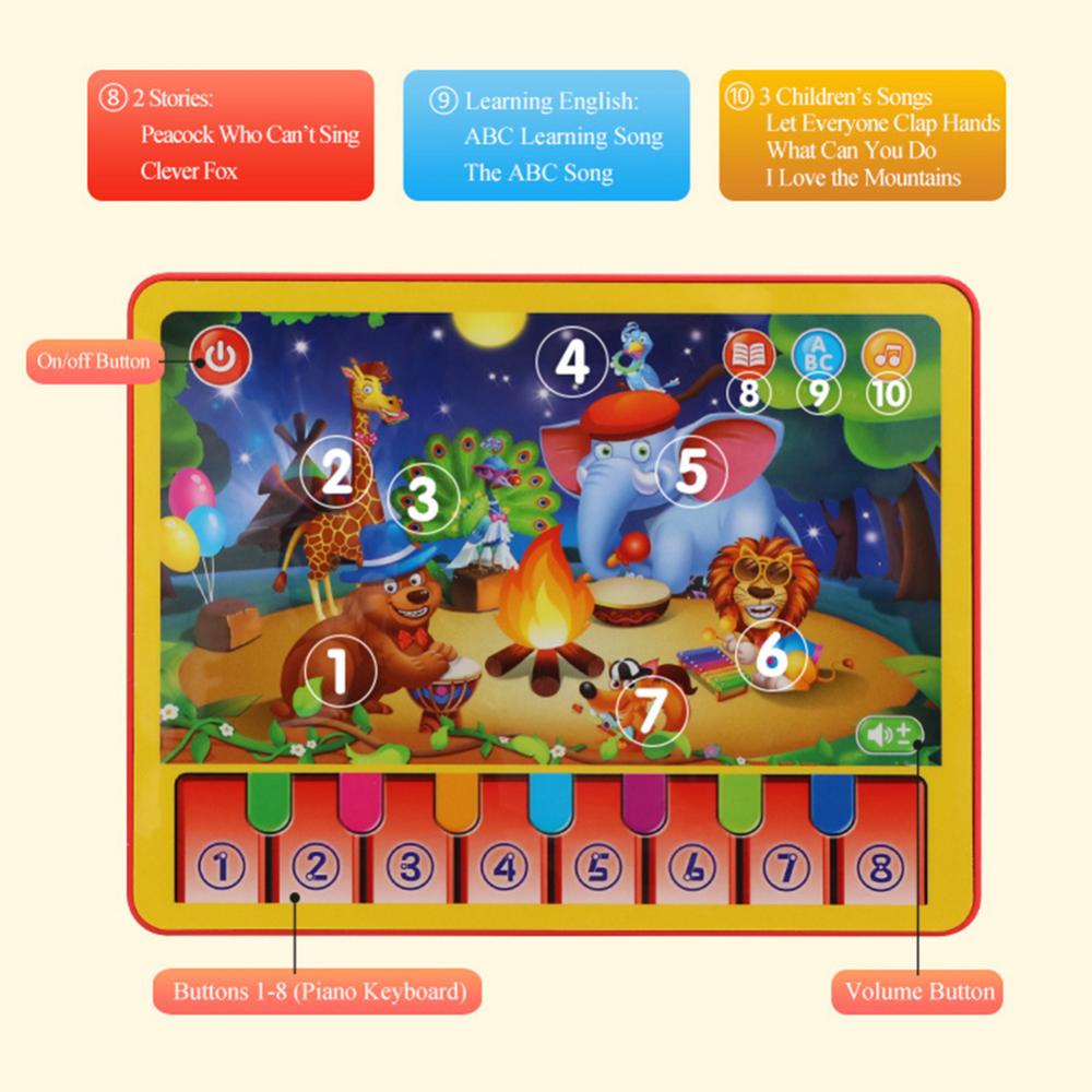 After installing the battery, touch the screen, you can hear 7 kinds of animal sounds, and English alphabet song, nursery rhymes, 8-key electronic piano, etc.